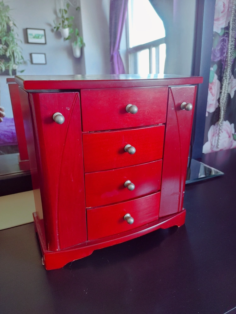 Selling a lovely red wooden jewellery box! It features a mirror and several compartments for organizing your precious items. It has a classic design and is in great condition, perfect for storing your rings, necklaces, and earrings. It would look great on a dresser or vanity!