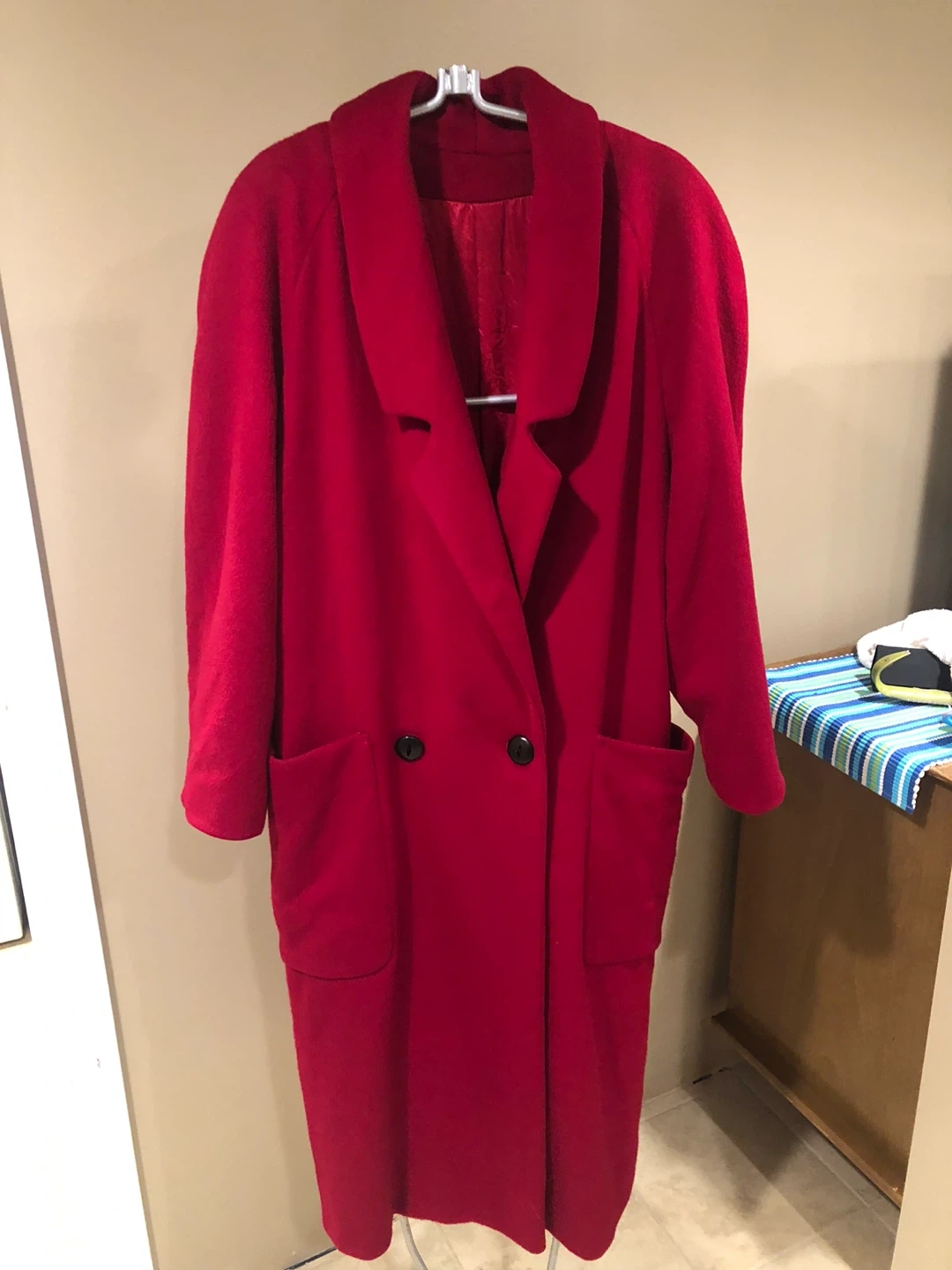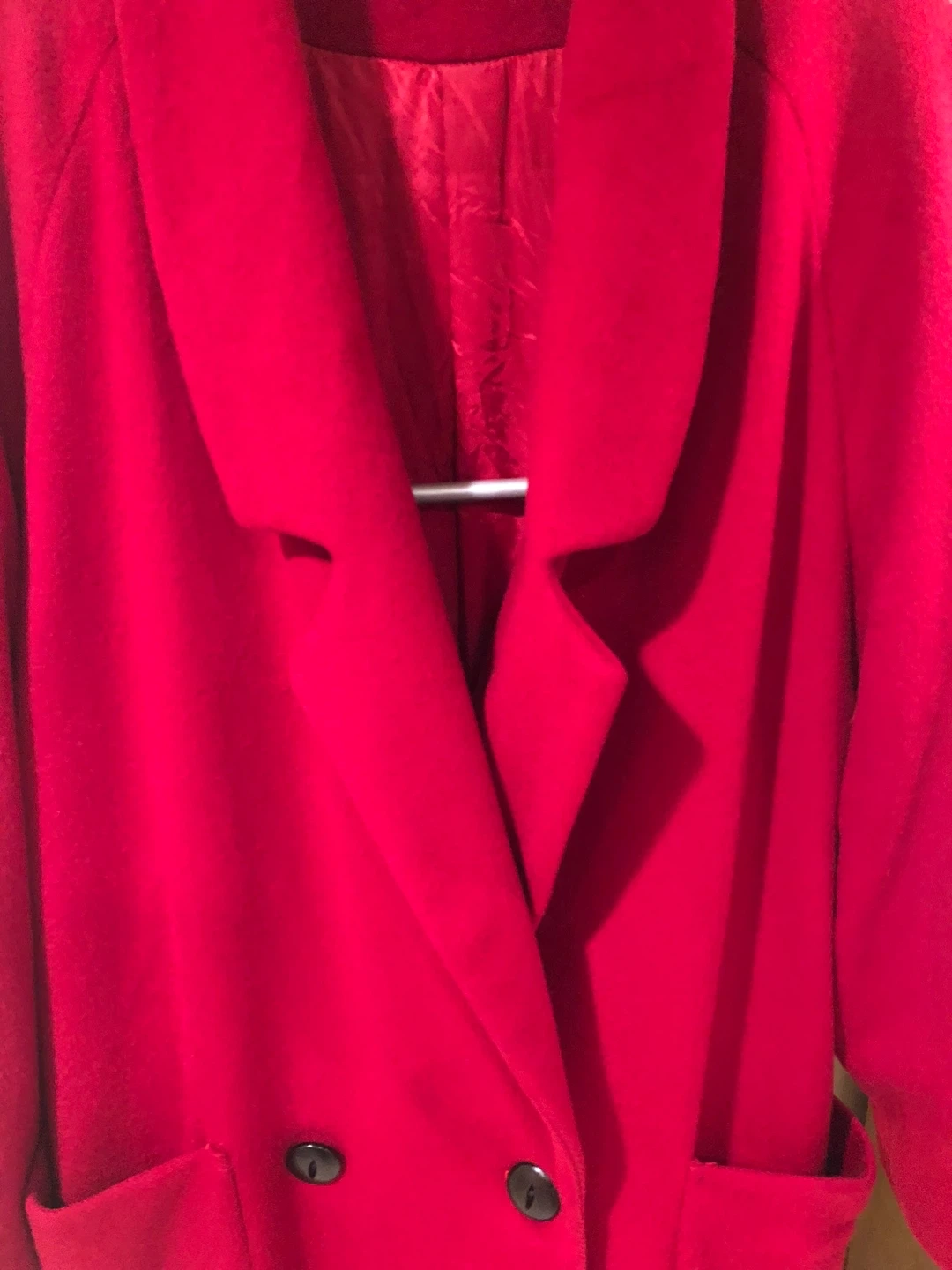 15Here's a lovely red wool coat! It features a classic double-breasted design with a wide collar and convenient pockets. Perfect for adding a pop of colour to your wardrobe on those chilly days