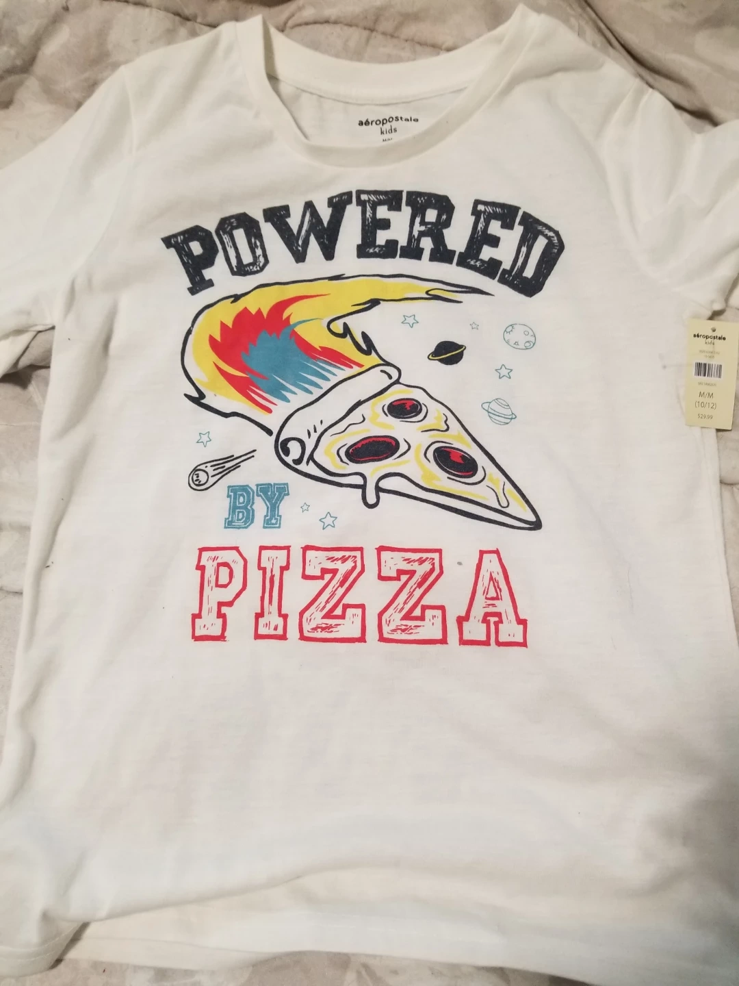 This Aéropostale kids t-shirt features a fun "Powered by Pizza" graphic. It's a size medium, fitting roughly a 10/12. The shirt's made from comfortable fabric, perfect for everyday wear. New with tag