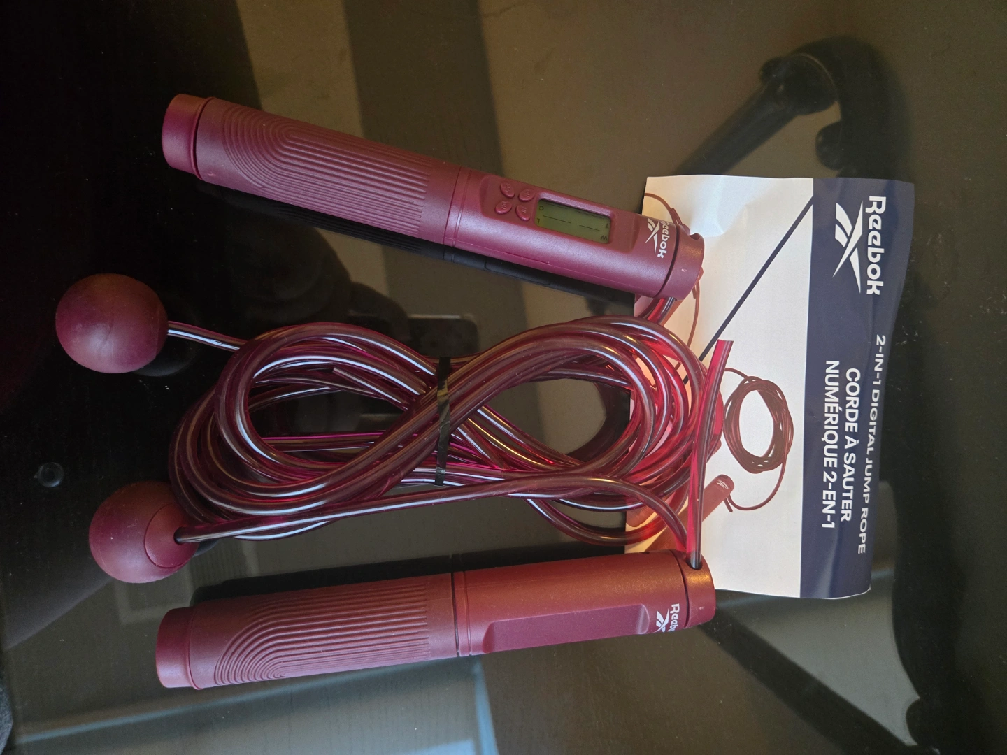 Burgundy jump rope. Digital counter. Two handles. Includes instructions. Selling for $19, pickup only.