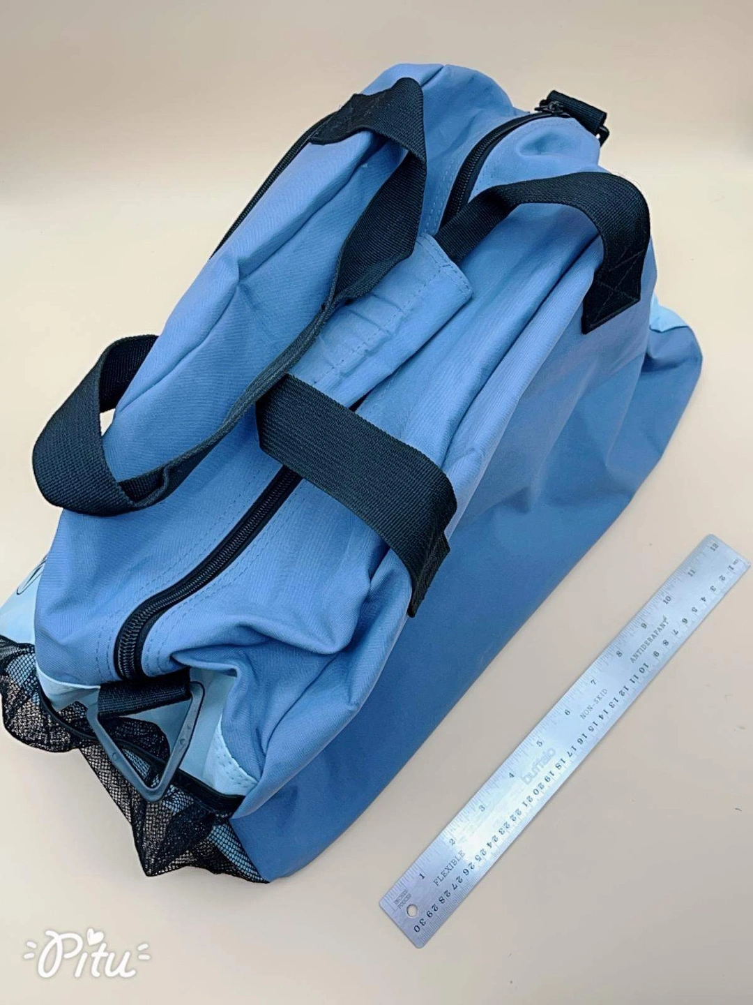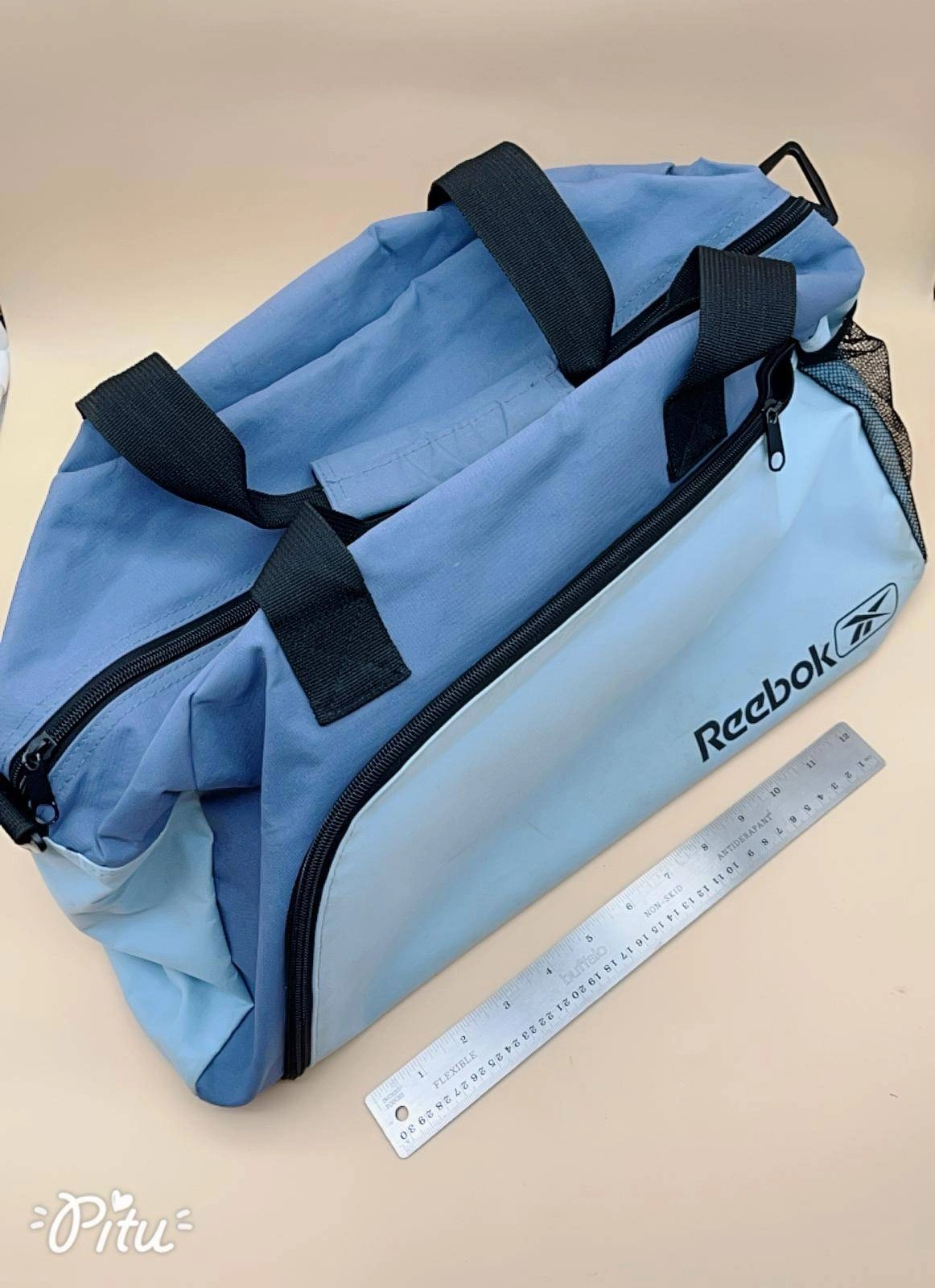 54Sporty navy blue Reebok duffel bag with white side panel, mesh accents, double handles, and zip closure—practical, durable nylon gym tote, roughly 18 inches long for workouts or travel. Bottom: Chic navy blue scalloped-edge tote in faux leather with structured handles and snap top—elegant, roomy bag about 12 inches wide for everyday style! 🎒👜