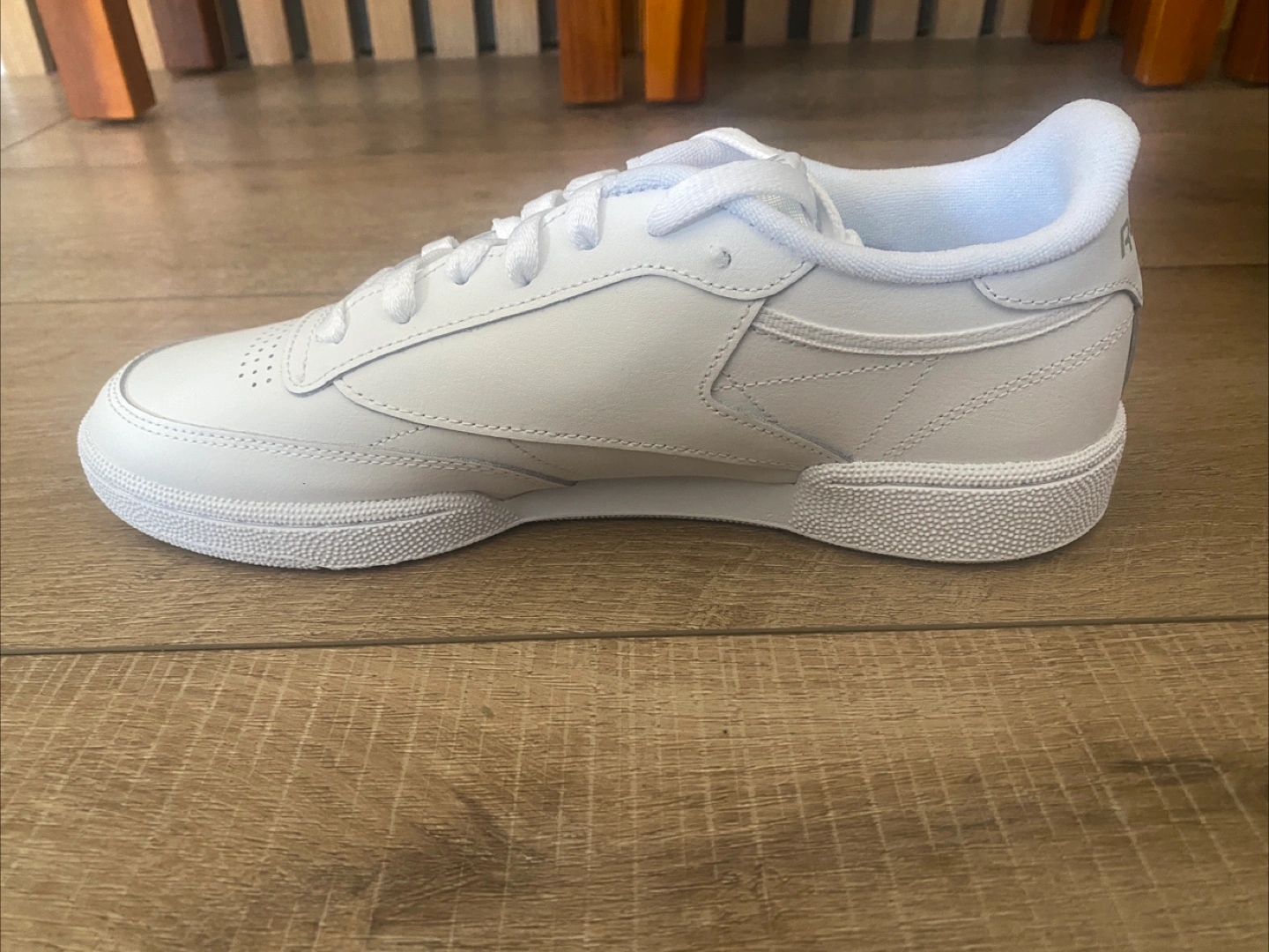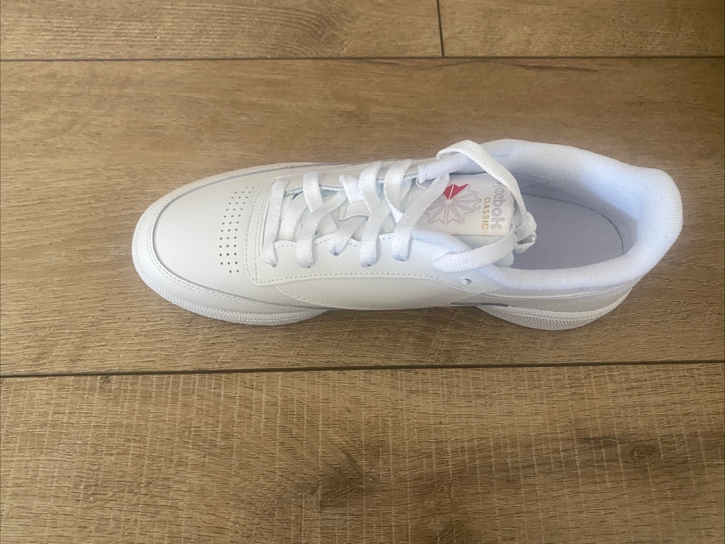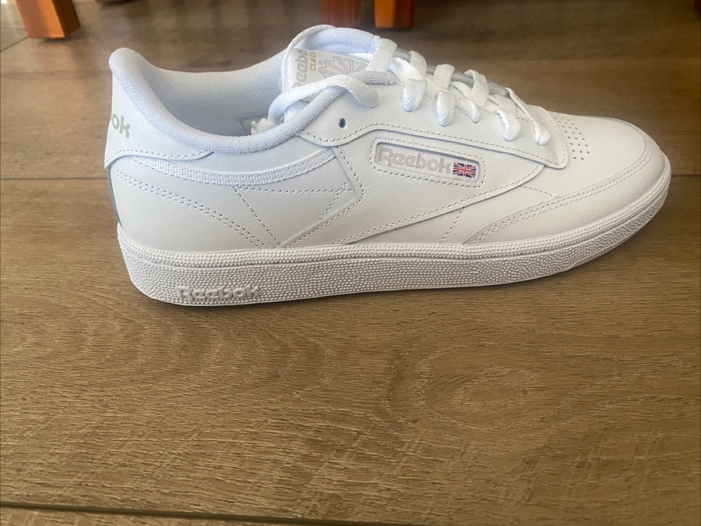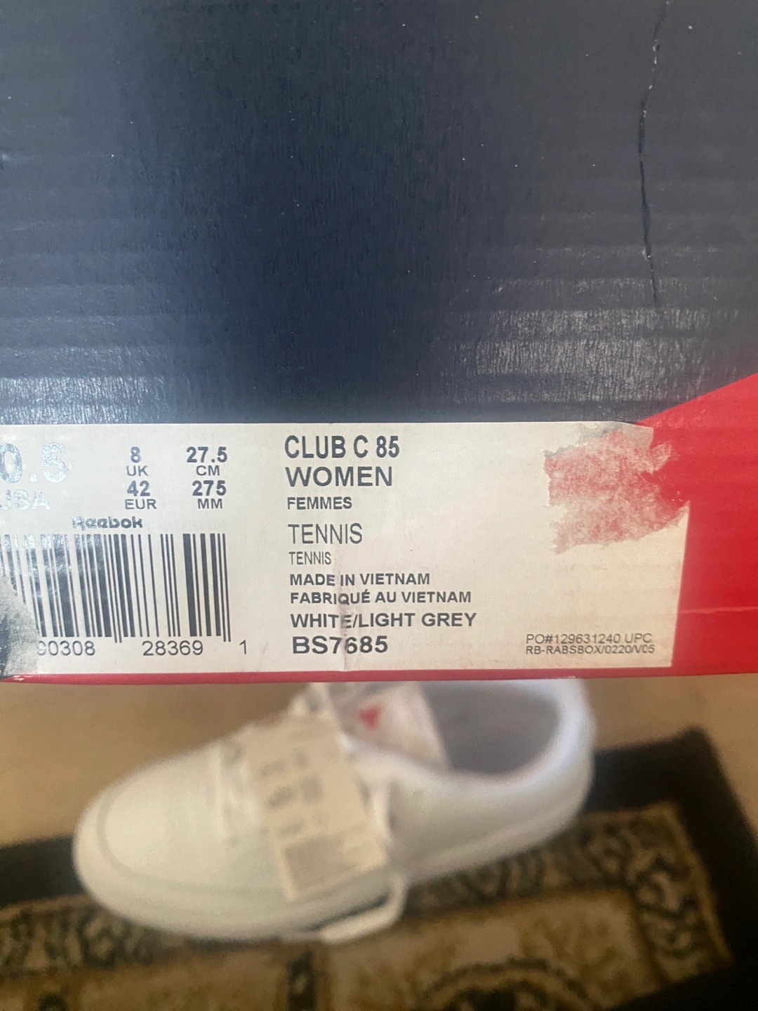 Women's Reebok Club C 85 tennis shoes. Size 8 UK, 10.5 US, 42 EUR. White/Light Grey colour. Brand new with tags. Made in Vietnam. I have never worn these shoes because they are a wrong size.