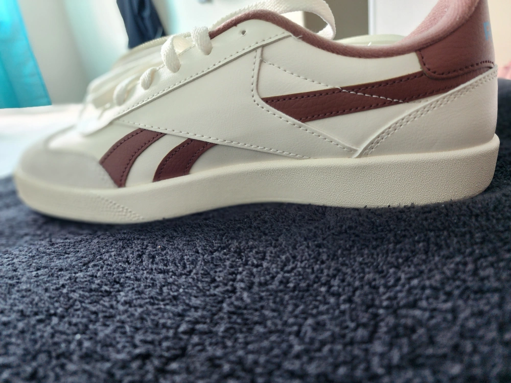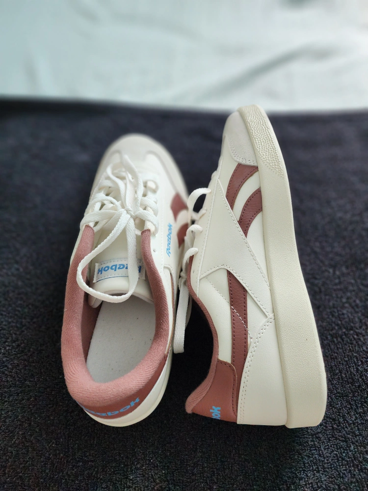 Selling a pair of Reebok Club MEMT shoes in size 9.5. They're in great shape and ready for a new home! The colours are a nice neutral off-white with brown and blue accents. Perfect for everyday wear!