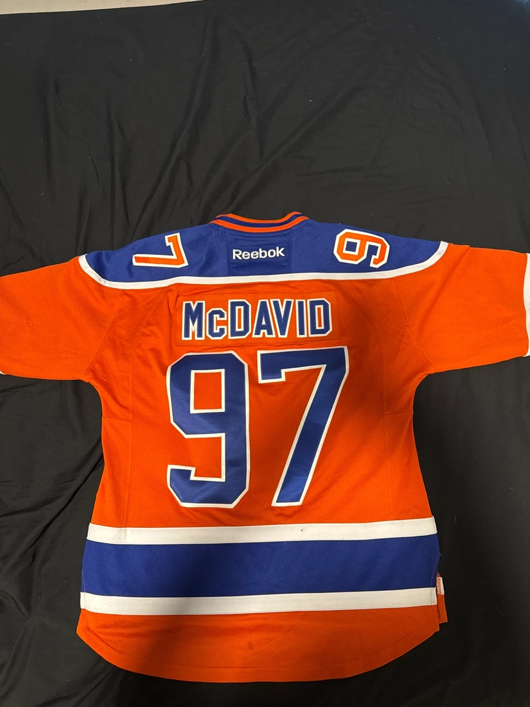 73Selling a Reebok Edmonton Oilers jersey with McDavid's name and number 97 on the back! The jersey is orange, blue, and white. Size: Small Very Good Condition