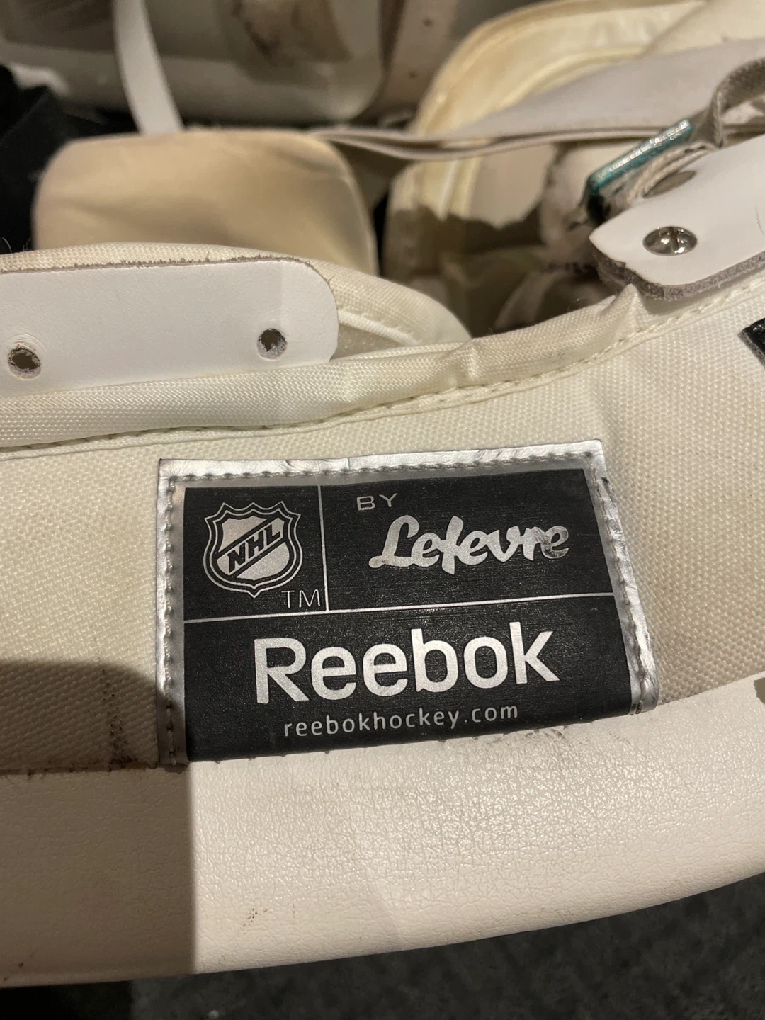 33Reebok Premier Pro P4 goalie pads. They are size 34+1 and white. Adult PRO pads NHL legal size.