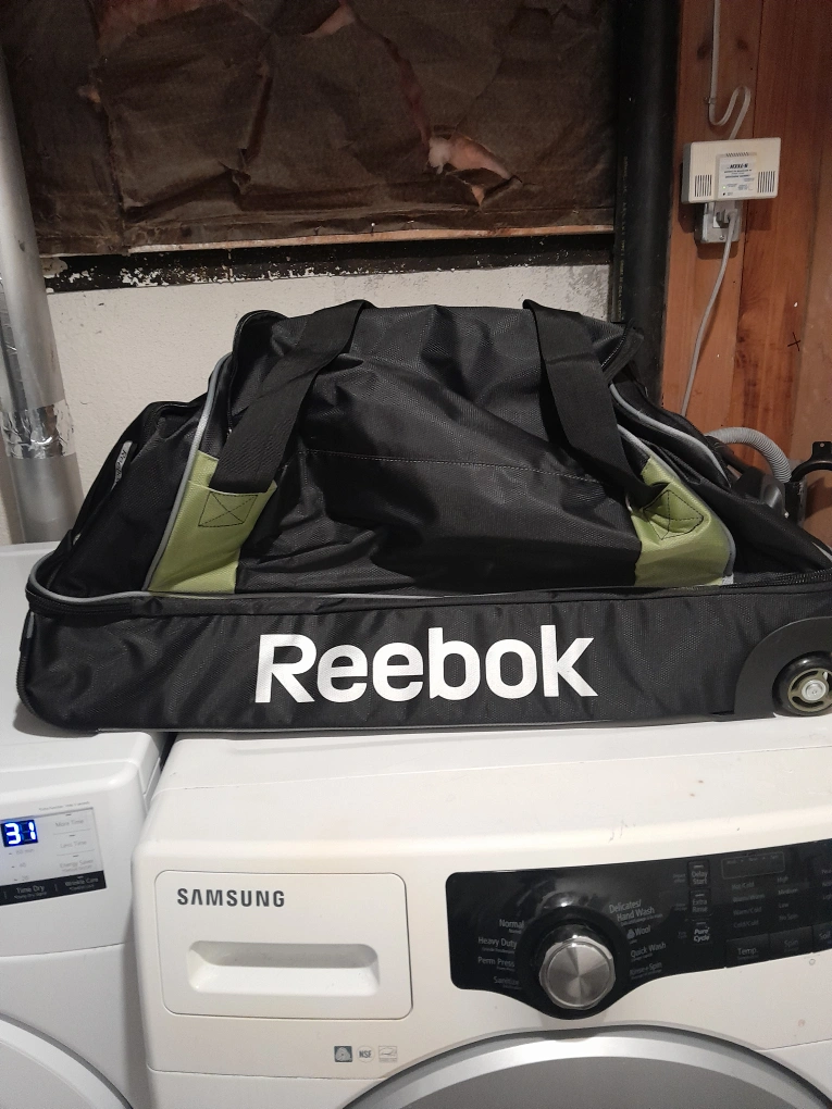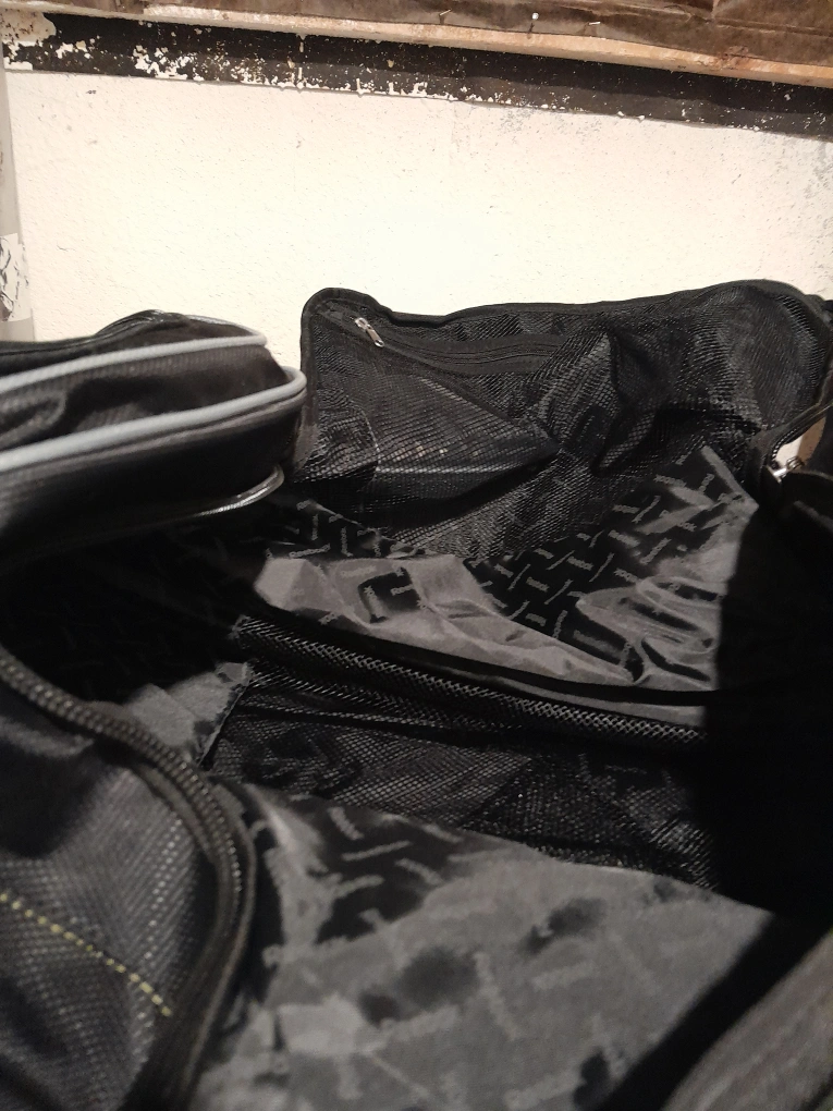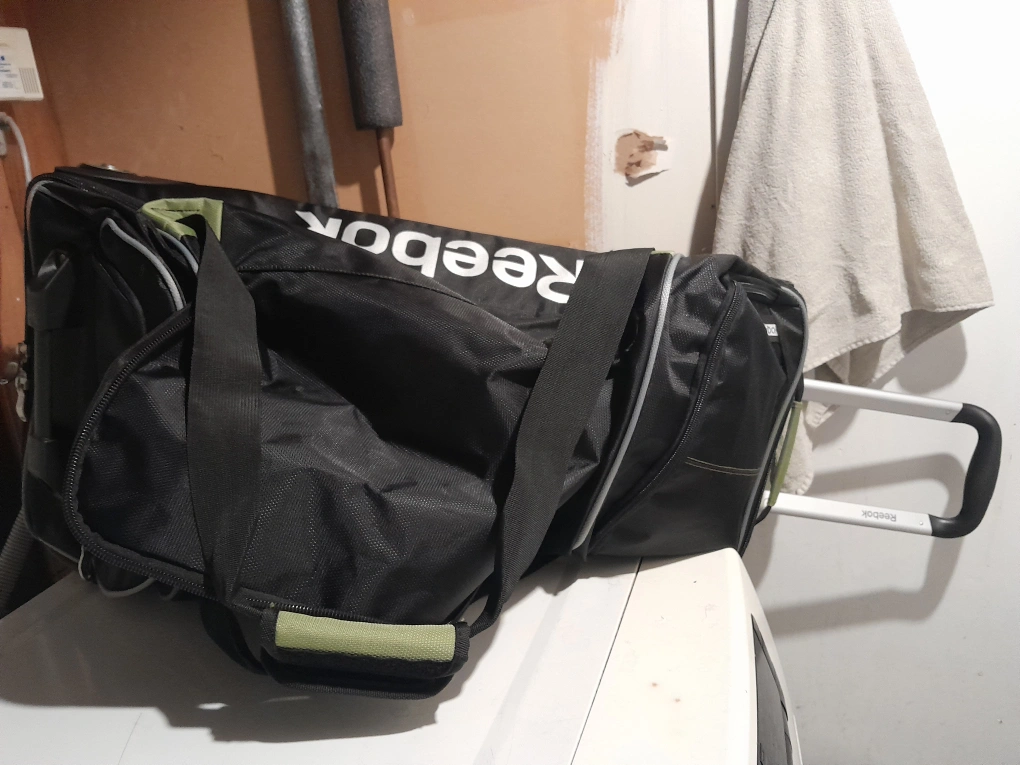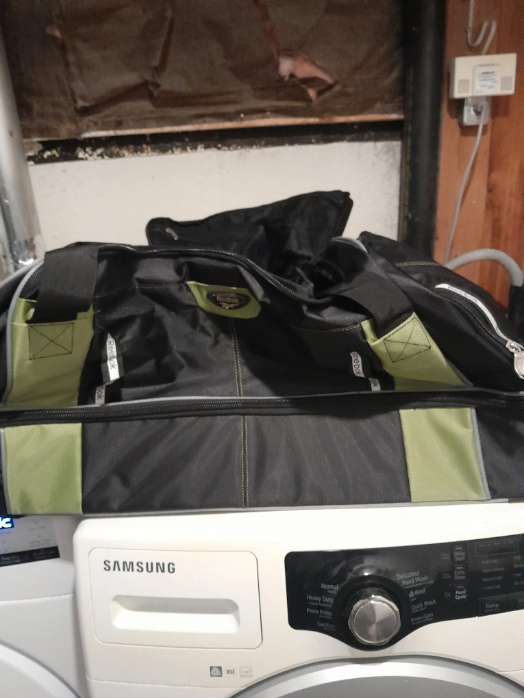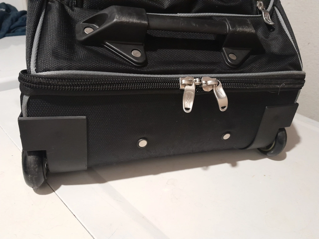 18Black and green rolling duffle bag with multiple compartments. Has a telescopic handle. Good condition.