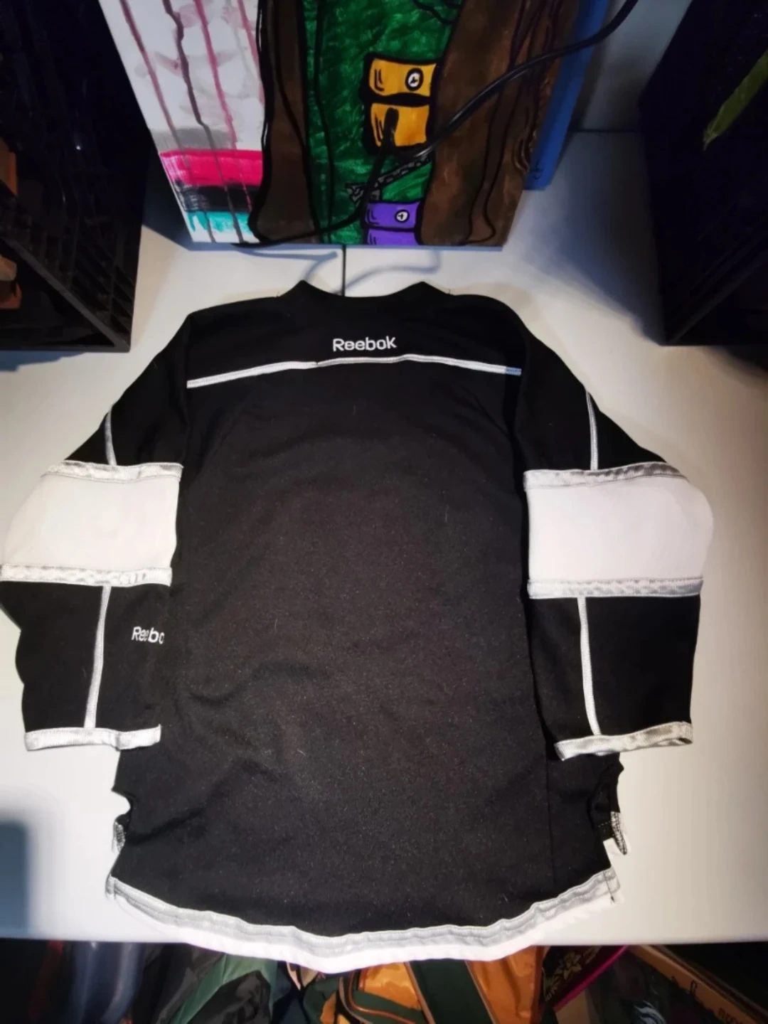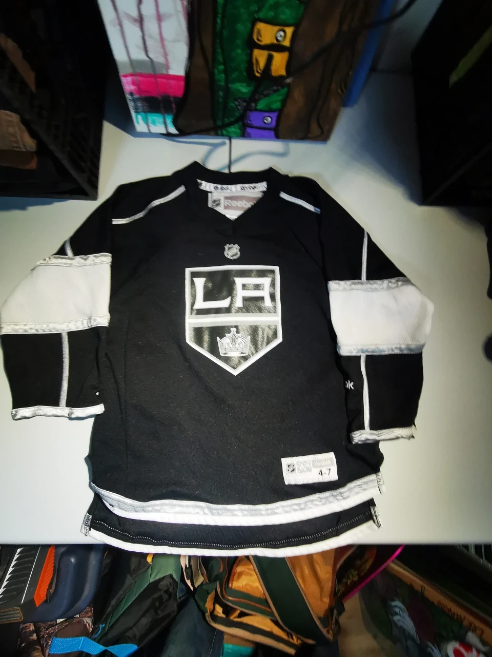 Selling a Reebok LA Kings hockey jersey. It's black with white accents and the Kings logo on the front. Great for any hockey fan! size youth 4-7