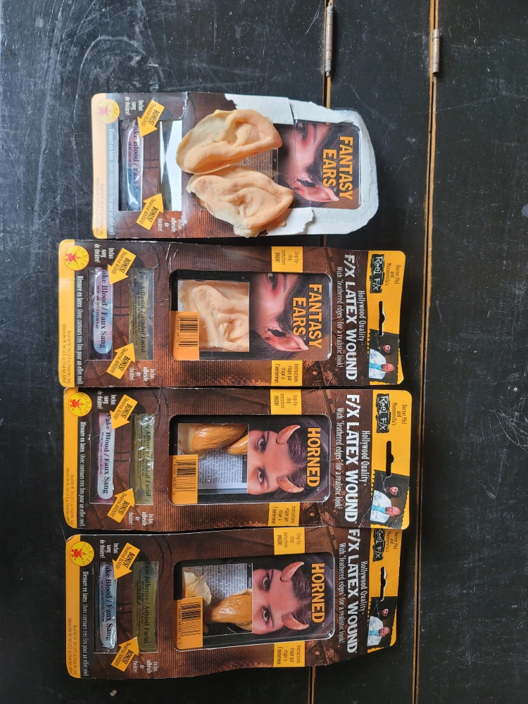 Selling some Reel F/X Hollywood Quality F/X Latex Wounds! These come with feathered edges for a realistic look. You'll get a mix of Fantasy Ears and Horned styles. Each package includes face adhesive and bonus fake blood for extra effect $5 each Pick up is Upper Stoney Creek L8J1J2 Text 416-565-2581 for quick reply