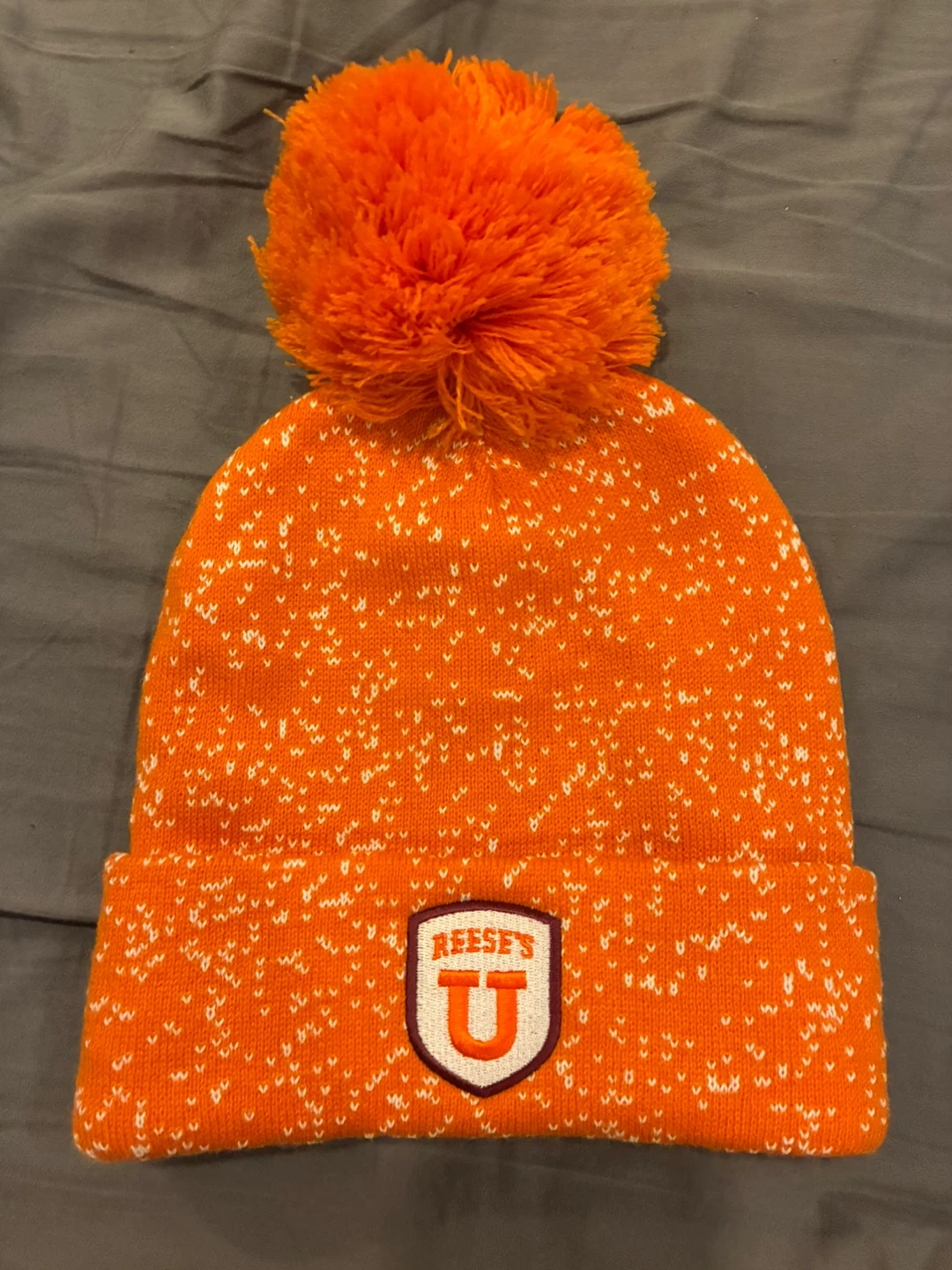 51Keep your head warm with this fun Reese's University beanie! It's a bright orange colour with a white speckled pattern and a cute pom pom on top. The Reese's U logo is stitched on the front