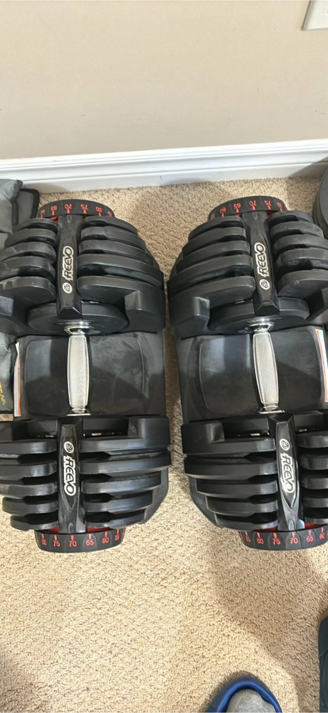 Selling a pair of REEVO adjustable dumbbells. They're in great shape and ready for a new home gym! You can easily adjust the weight to from 10-90 lbs.