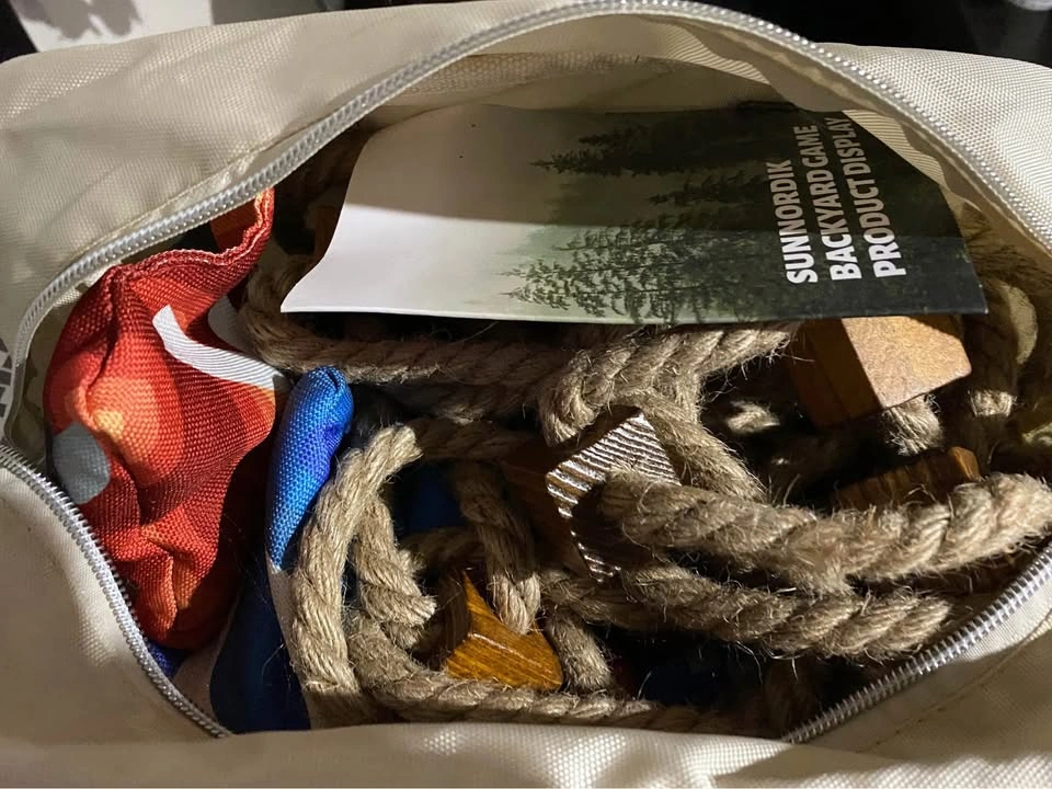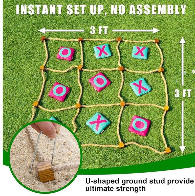 This outdoor rope game board is made of 1cm hemp rope and sturdy pine blocks. Providing ultimate strength and durability, the game comes with 10 carefully designed X and O bean bags and is waterproof.