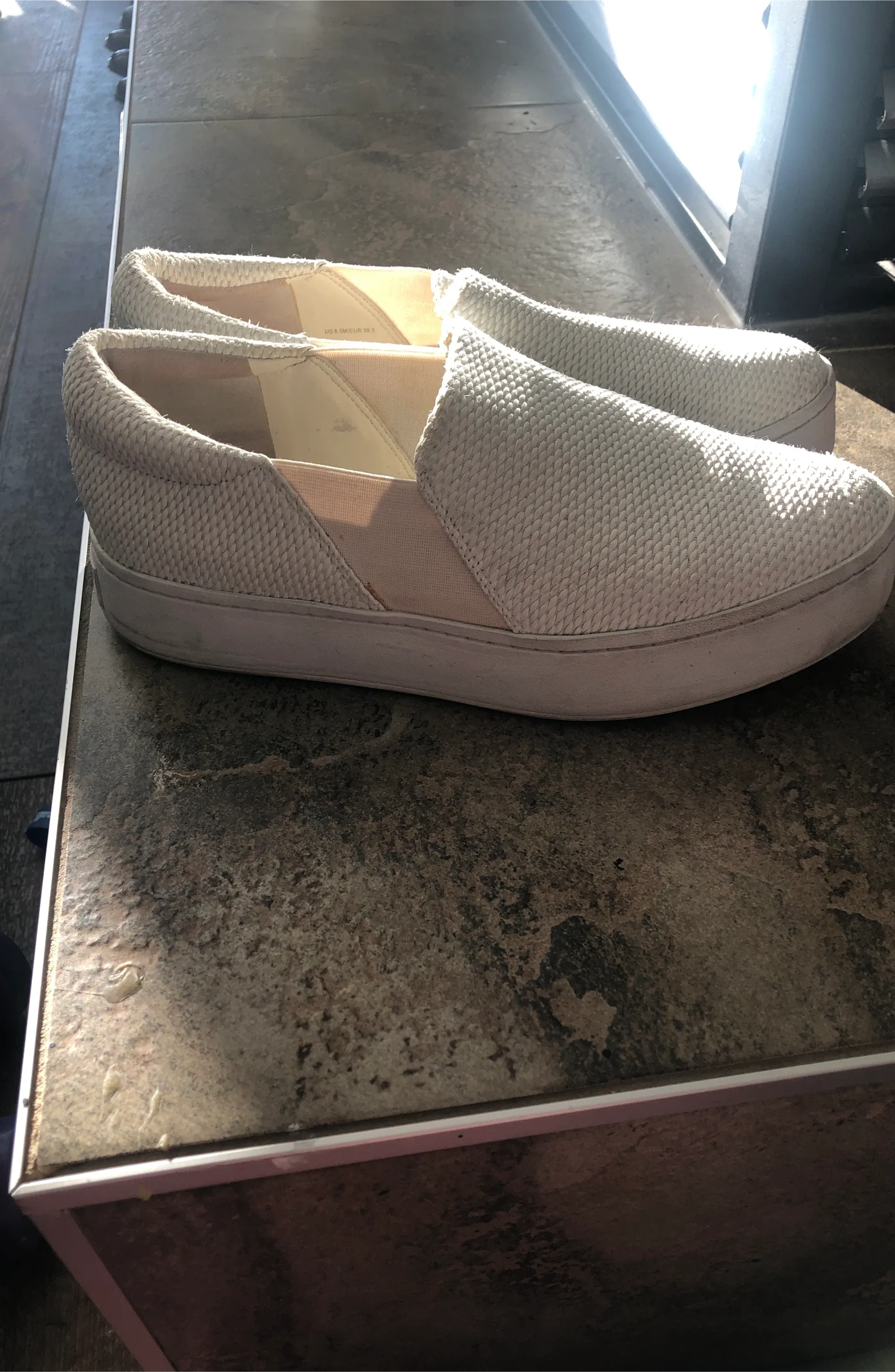 Selling a pair of white slip-on shoes in size 8.5. They have a textured upper and are in good condition. Perfect for casual wear!