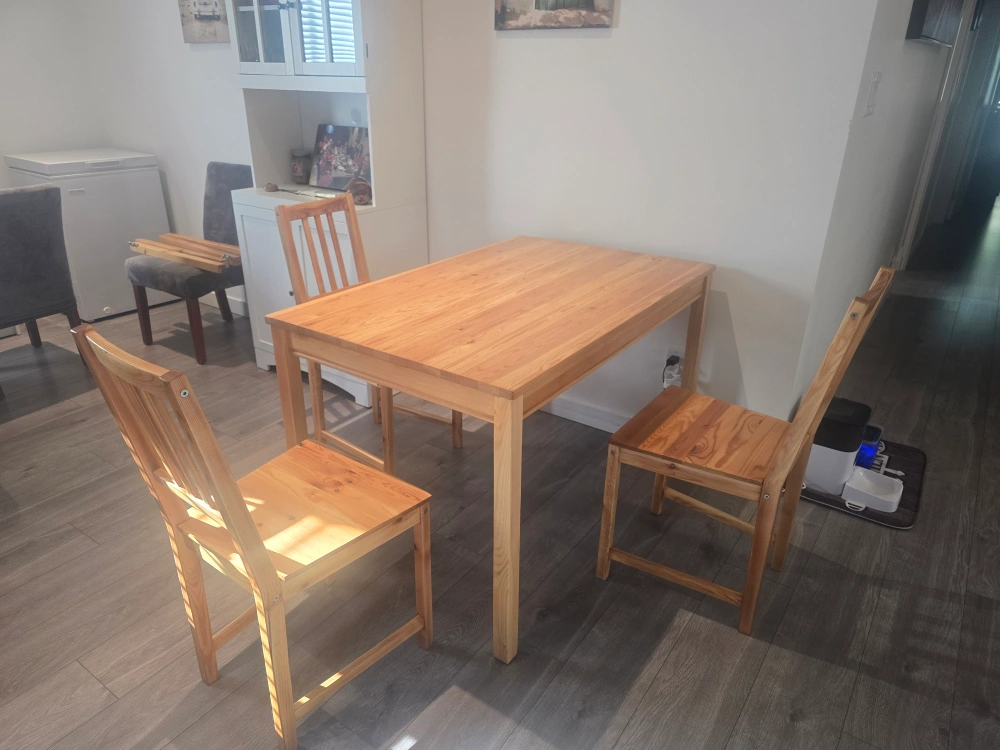 70Selling a lovely IKEA pine dining table with three matching chairs. The table measures approximately 46 inches in length and 28 inches in width, making it a great size for smaller dining spaces or a kitchen nook. The set is in good condition and ready for a new home! I have three chairs and a Table that are completely refinished. I also gave three matching chairs in good condition with factory finish. If needed I also have 4 matching ikea chairs that are well used with very well used new. The refinished Table and chairs have one coat of Bona dri-fast sealer and 2 coats of Bona woodline Satin. these are commercial grade products. it will last !