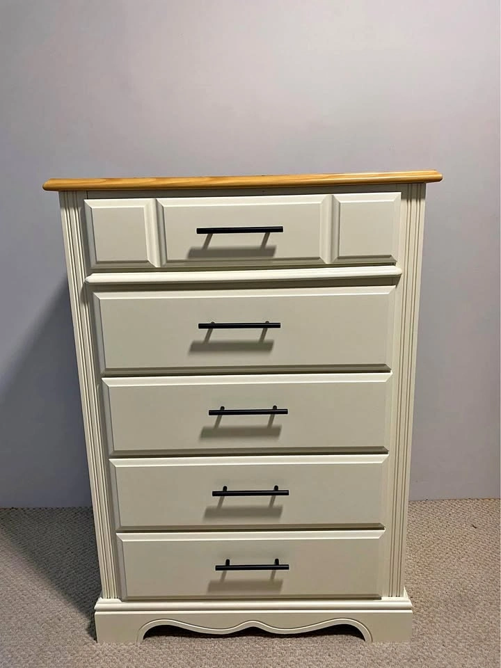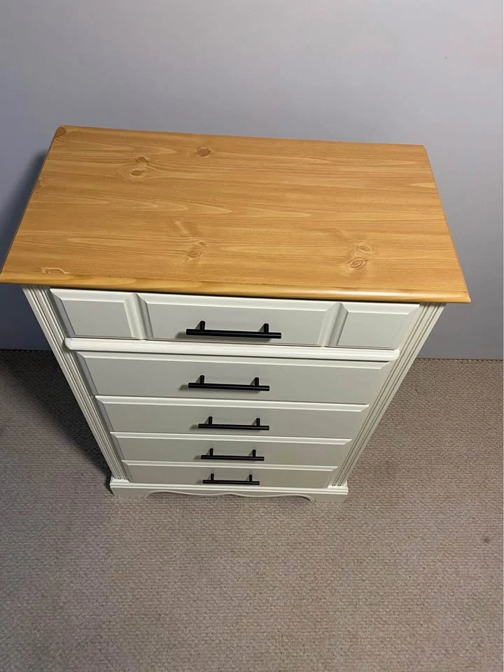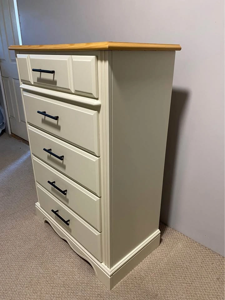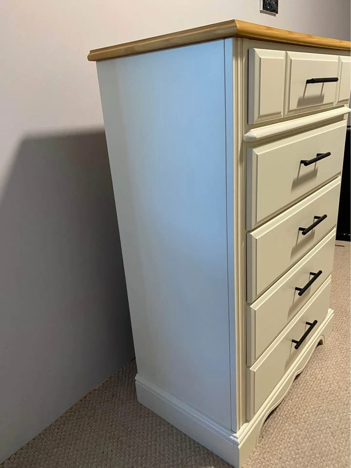 15Refinished dresser β refreshed and modernized! The creamy color is close to the original β I liked its warmth, so I decided to keep it. I repaired small scratches and imperfections, smoothed everything out, and sealed it with a protective finish to give it a clean, renewed look. The top was left original β it was in great condition and had a beautiful natural tone. I replaced the old double handles with single centered matte-black ones for a modern, minimalist feel and better comfort. The result is a piece that feels fresh, stylish, and timeless β perfect for any bedroom or hallway. π Dimensions: Height β 48β (122 cm) Width β 34β (86 cm) Depth β 18β (46 cm) π Port Coquitlam π° $250 Message me if youβd like to see it in person or have any questions. If you have any furniture that needs refinishing or restoration β feel free to reach out. I take on custom projects and can give your piece a second life.