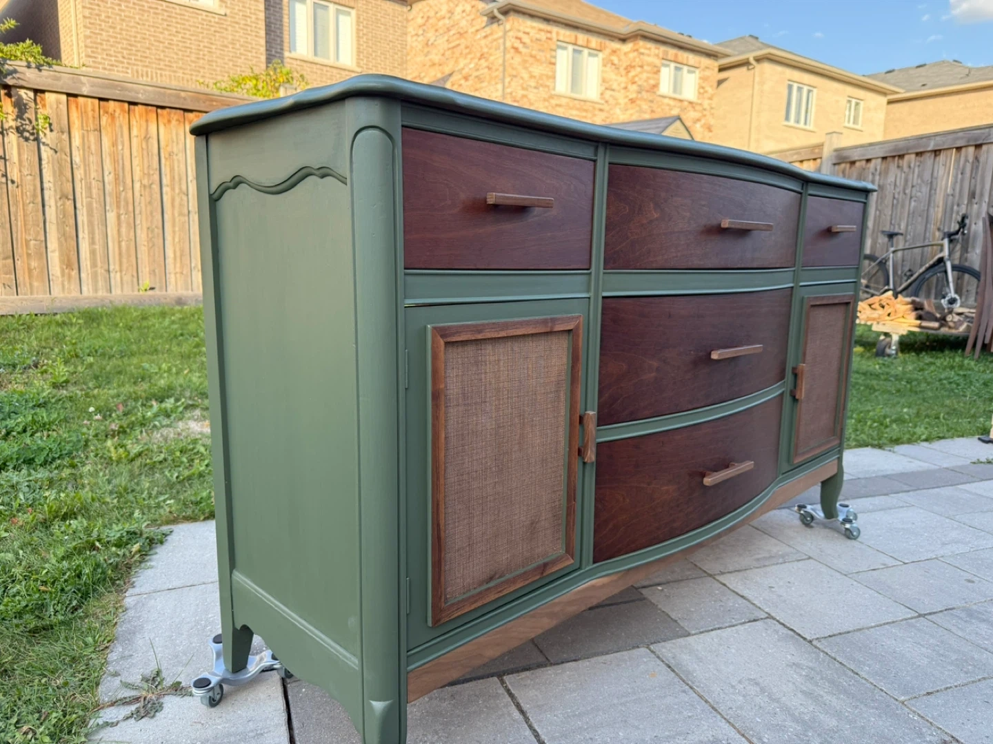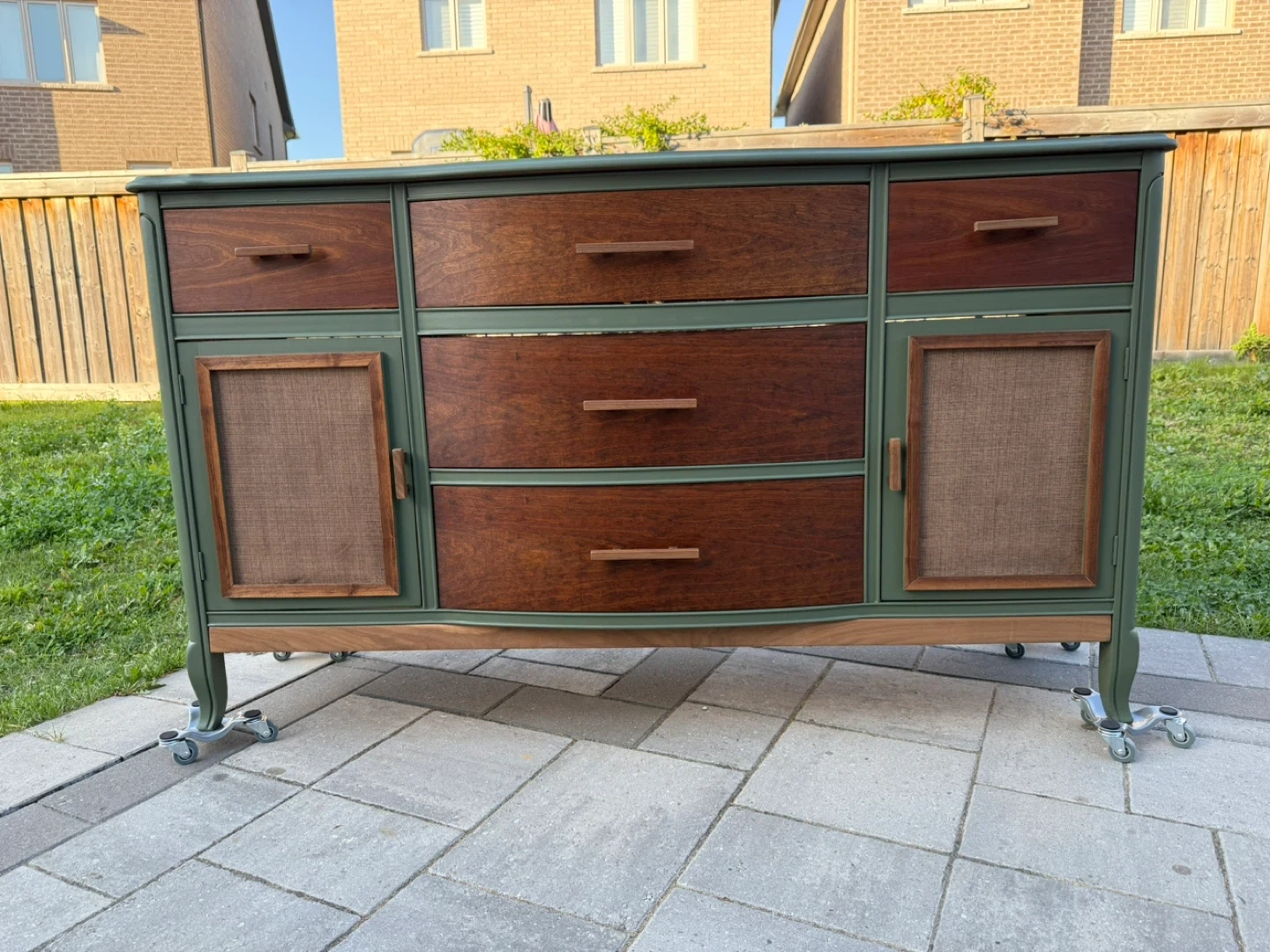 10Selling a refinished wood dresser. It features a lovely combination of green and brown tones. It has multiple drawers and two doors with woven panels, offering ample storage space. The dresser is also equipped with wheels for easy moving around the house