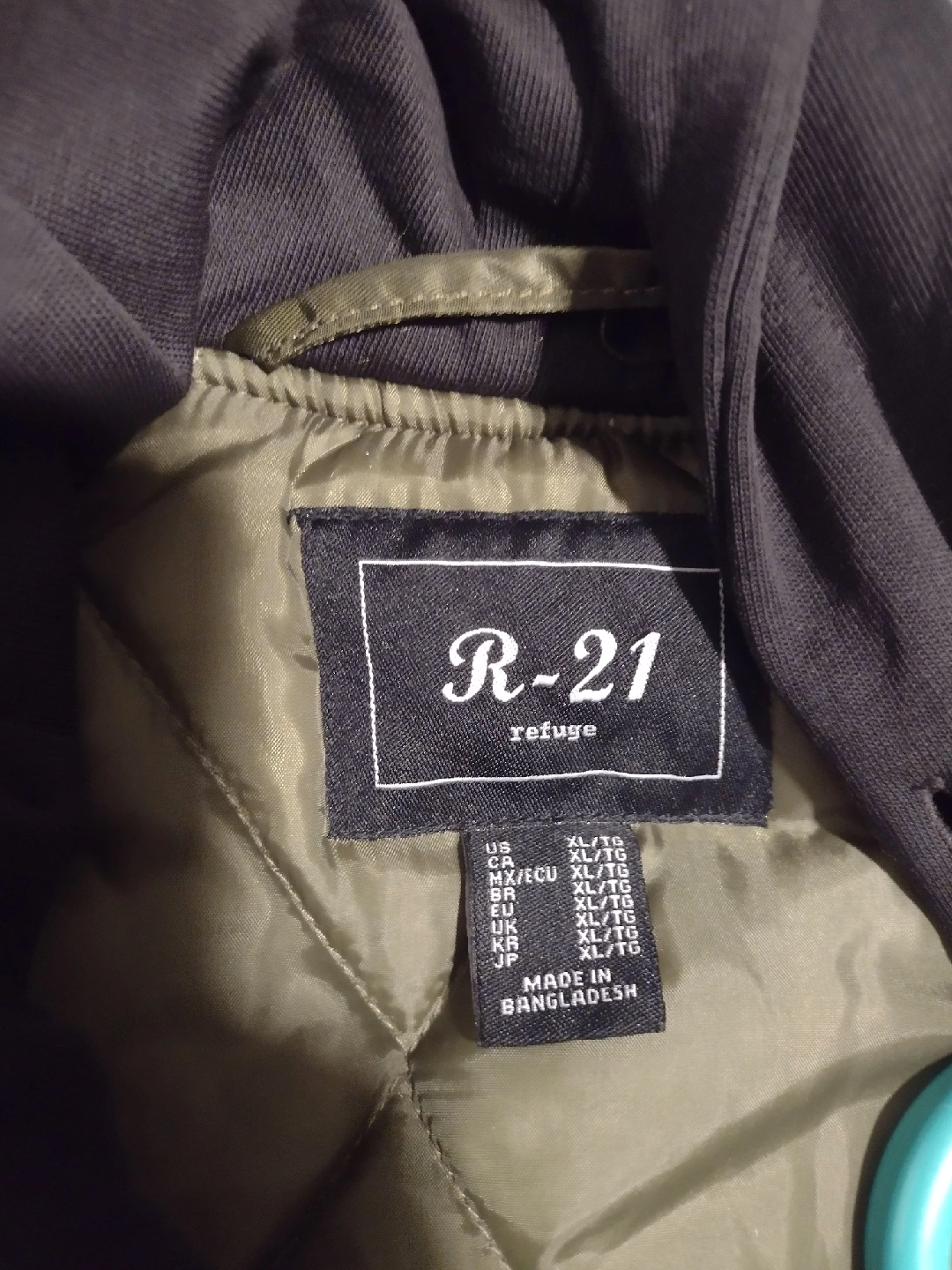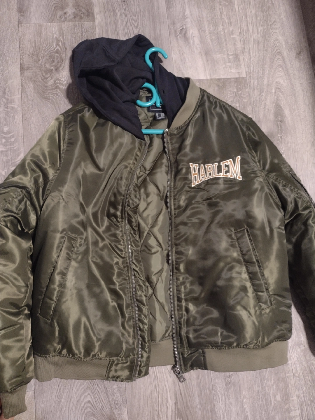 Selling a Refuge R-21 Harlem bomber jacket The jacket is olive green with a black hood. It has a quilted lining and 'Harlem' embroidered on the front. It's in great condition and ready for a new home! made in Bangladesh
