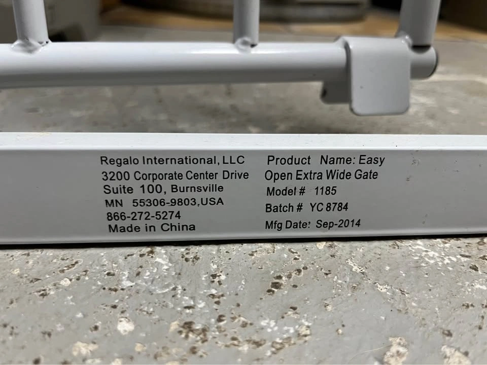 61Regalo Baby Gate in White Used in good condition. Just needs a good clean, it has been in storage for several years. Still works great. DOES NOT COME WITH PRESSURE MOUNT RODS Can also be used for pets, I used this at home when training my puppies. has a convenient one handed latch release when in use so you don’t need two hands free to open