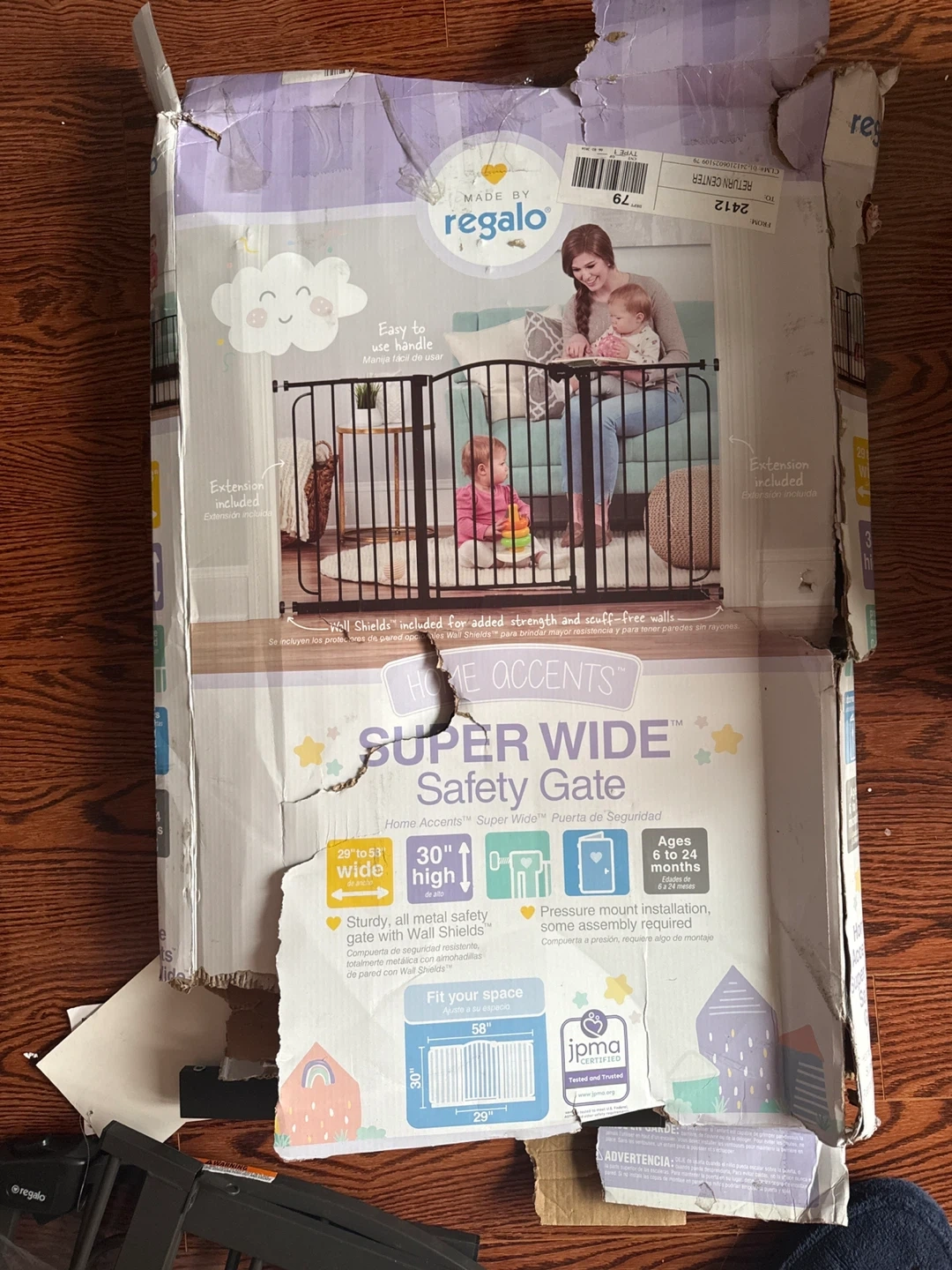 Brand New Regalo Super Wide Safety Gate – $20 ✅ Never üşen ✅ Only the screws/mounting hardware are missing ✅ Gate and extensions are included ✅ Box is damaged but the product itself is in excellent condition You can easily find the screws at any hardware store (Home Depot, Canadian Tire, etc.). Pickup only. First come, first served.