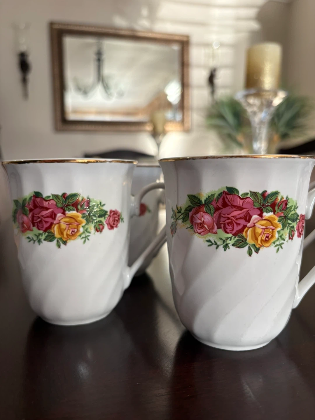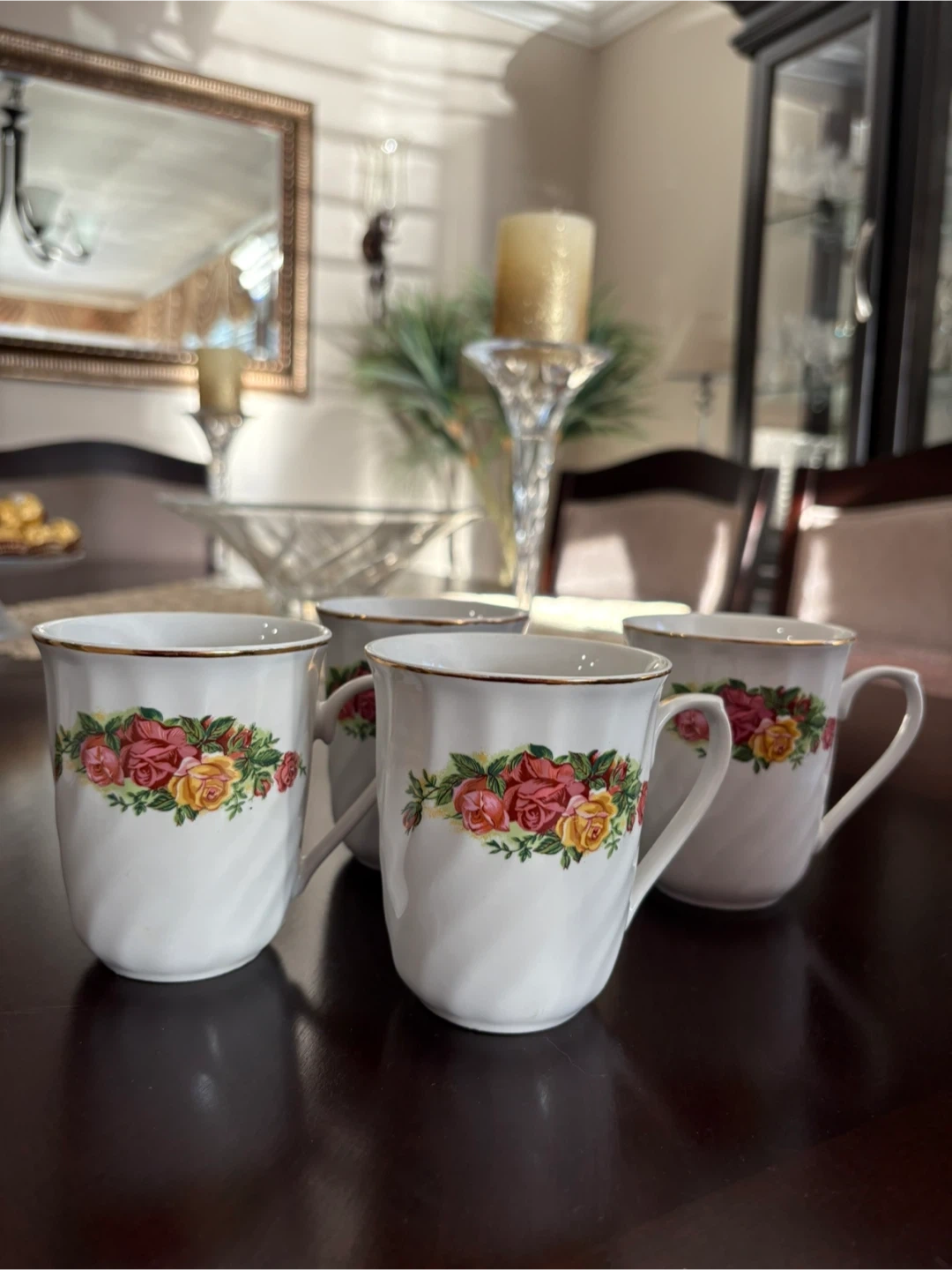 Selling a set of 4 Regent China mugs featuring the English Rose design. These mugs are in great condition and would be lovely for tea or coffee. They have a delicate floral pattern and a gold trim. **I also have another set of 4, if you are interested in all 8 cups let me know and we can work out a price**