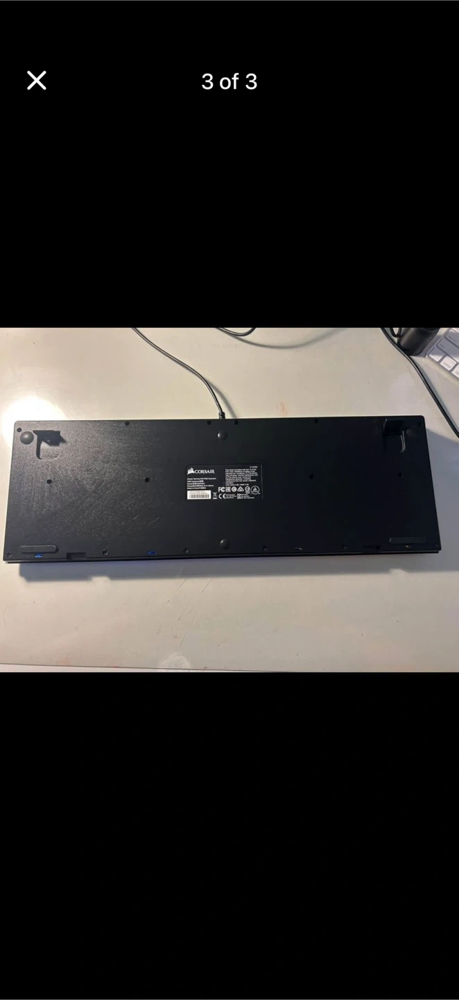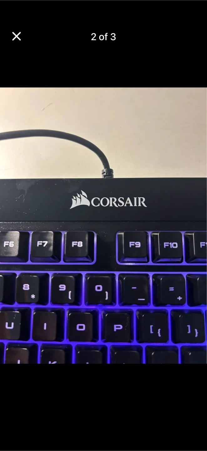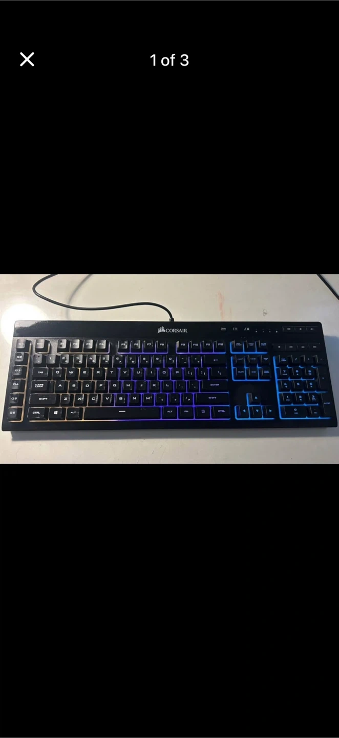 A black Corsair gaming keyboard with customizable RGB backlighting. It's a full-sized keyboard with a wired USB connection. This keyboard offers a responsive typing experience for gaming or everyday use.