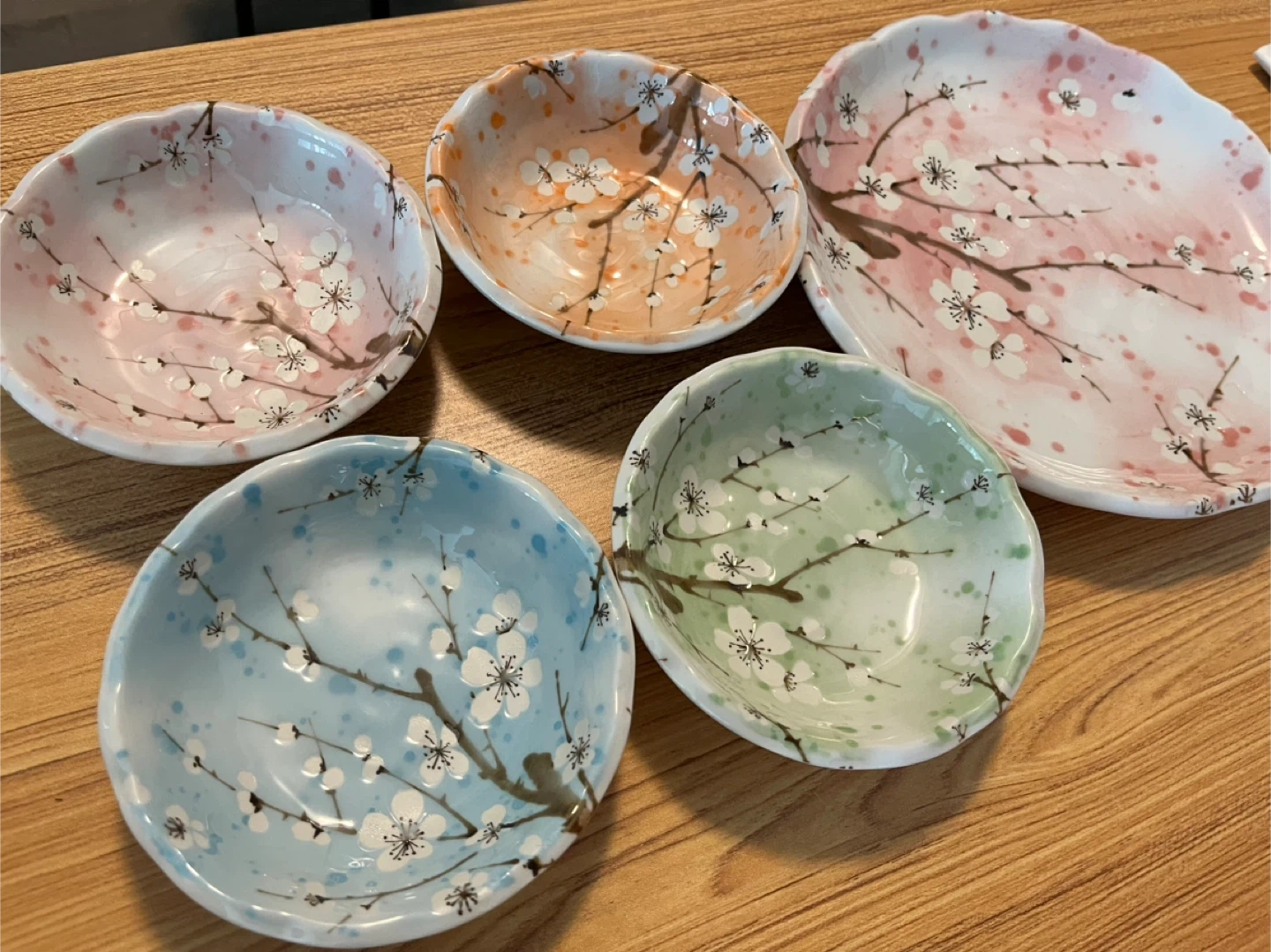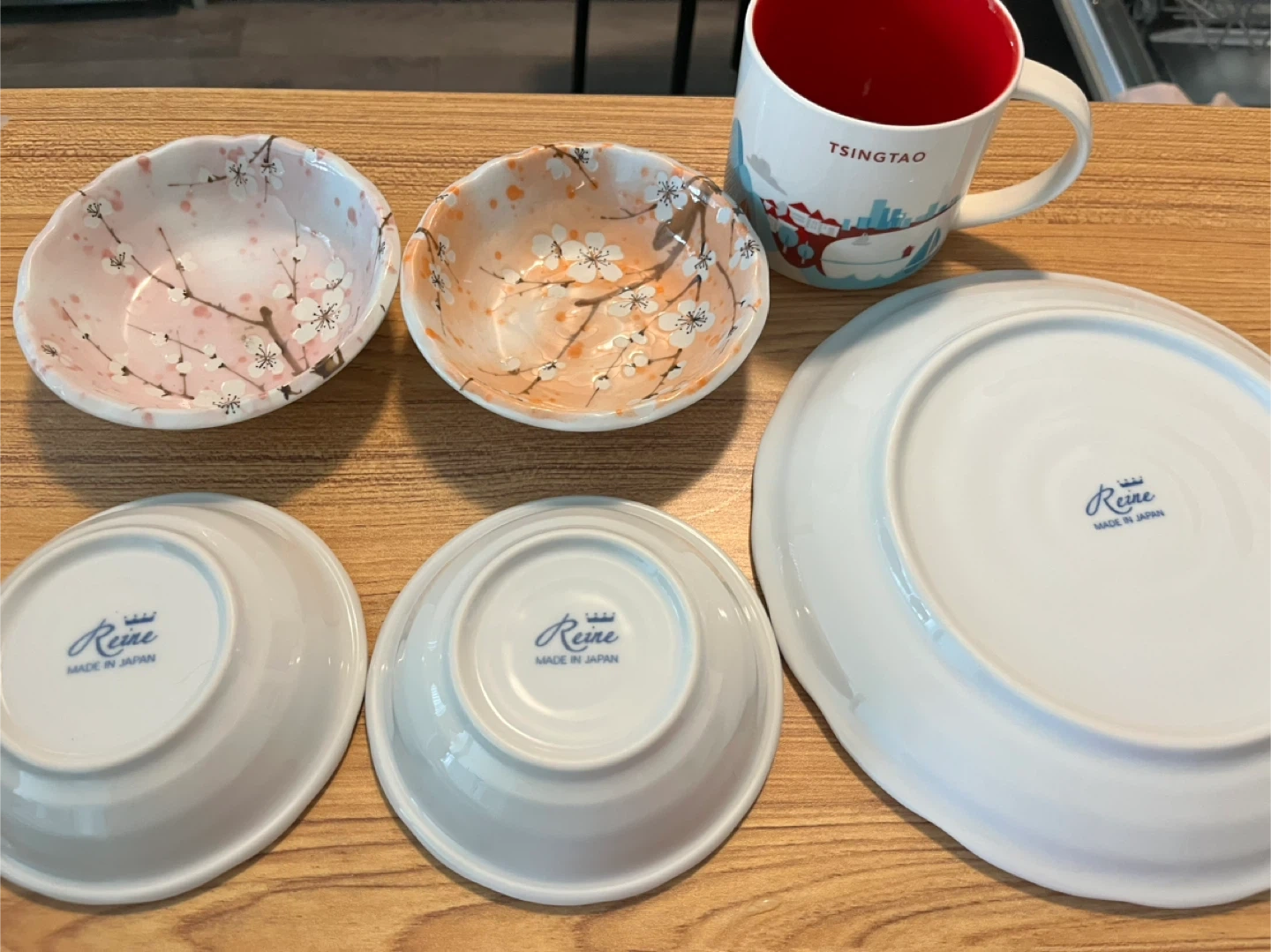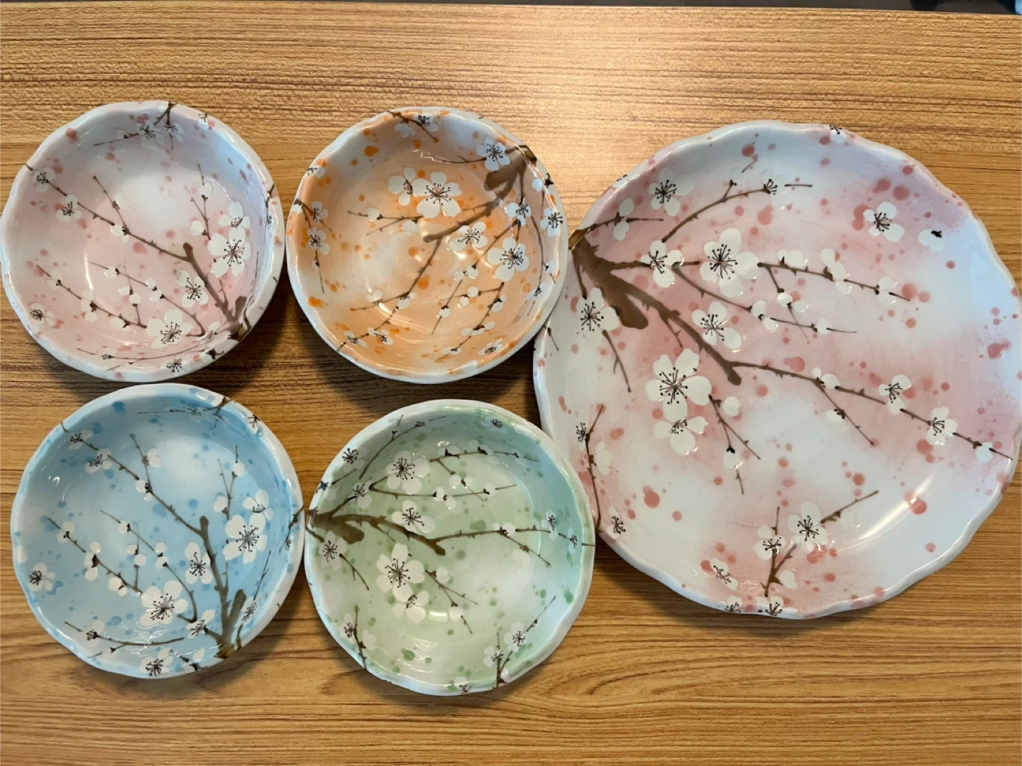 Selling a beautiful set of Reine Japan 4 small plates (bowl?) and a big plate, all featuring a lovely cherry blossom design. The set includes four bowls in different colours (pink, orange, blue, and green) and one large plate. These are perfect for adding a touch of elegance to your dining table! ********Moving-out Sale****** Pick-up is available only between Oct 26 and Oct 27 Barely used. still clean with no chips. The starbucks cup is used to compare the sizes