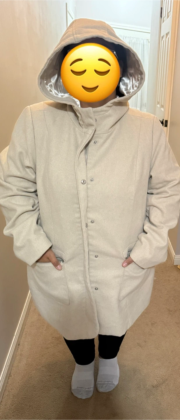 23Selling a Reitmans beige hooded coat in size 2X. The outer shell is made of 78% polyester, 13% wool, 6% acrylic, 2% nylon, and 1% viscose. The lining is 82% cotton and 18% polyester. It's in great condition and ready for a new home!
