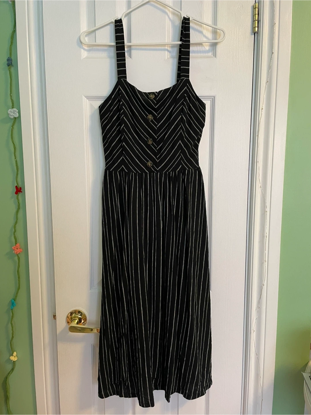A light, flowy summer dress. Black with white stripes. Buttons up in the bodice. Adult size small