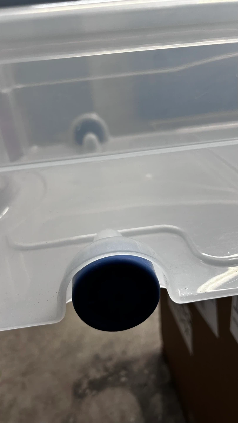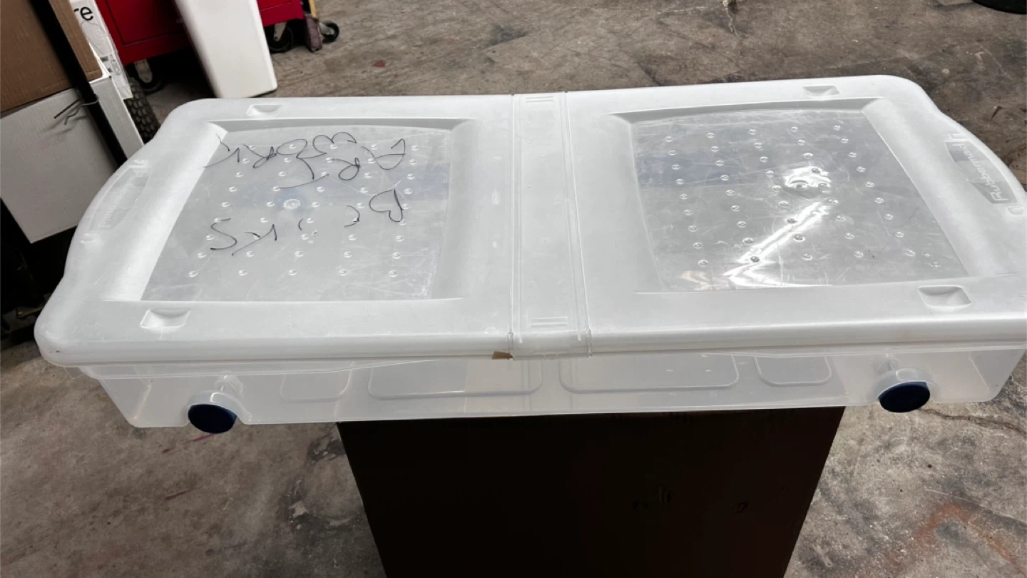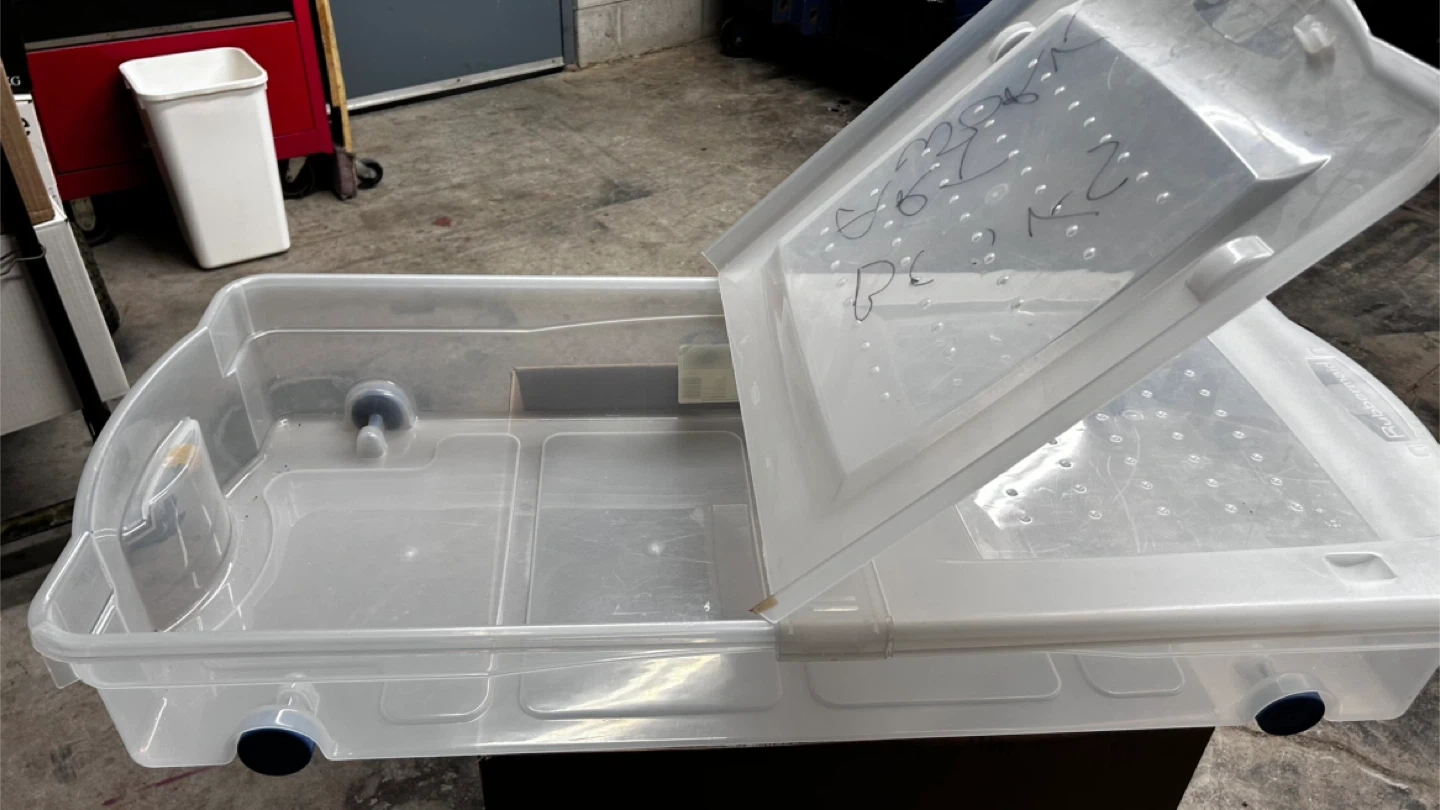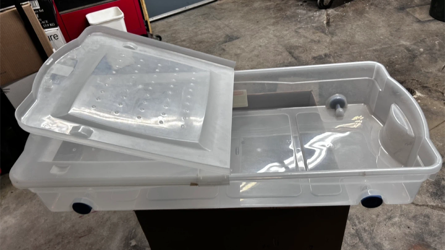 This is a Rubbermaid underbed storage box with wheels. It measures 16.8 gal / 63.6 L and has dimensions of 43 x 19.5 x 6.7 inches. It's designed to fit easily under most beds.
