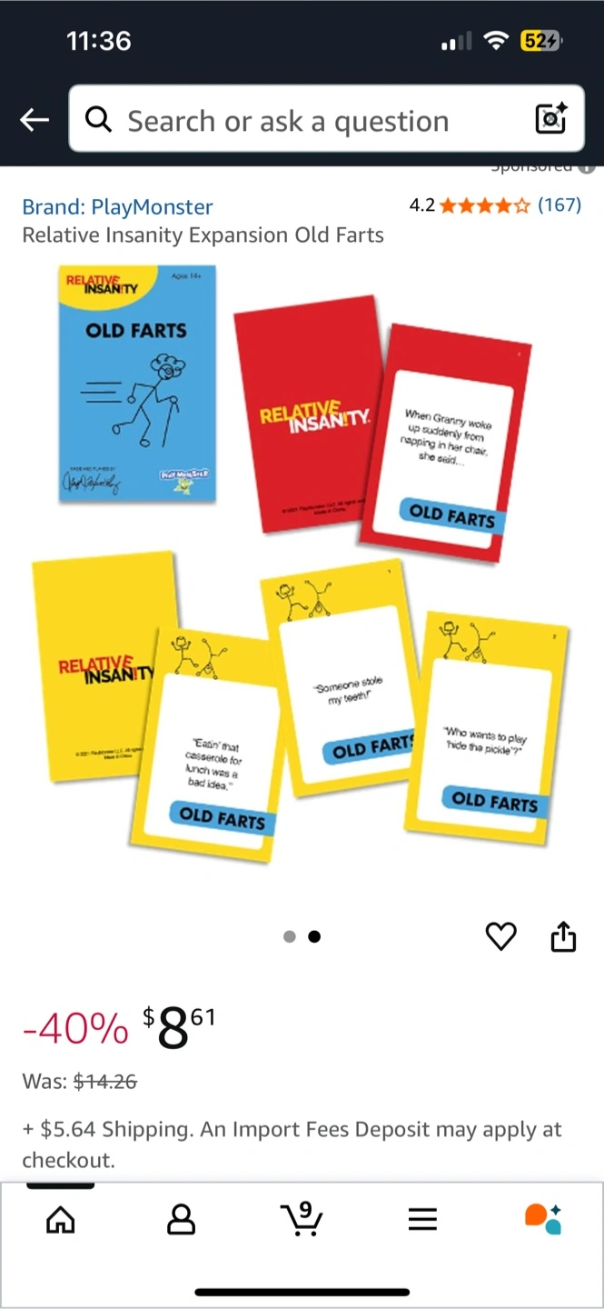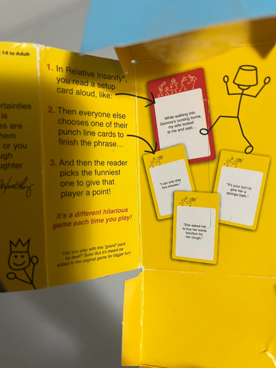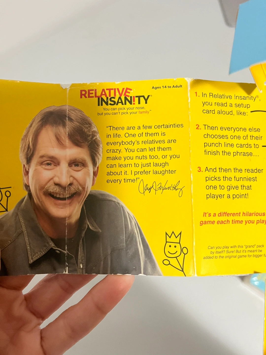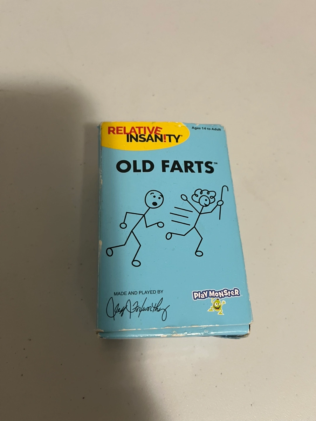 Selling a brand new, sealed copy of Relative Insanity: Old Farts card game! It's made and played by Jeff Foxworthy and is suitable for ages 14 to adult. This hilarious game is sure to bring laughter to your next gathering. Share the insanity with your friends and family!