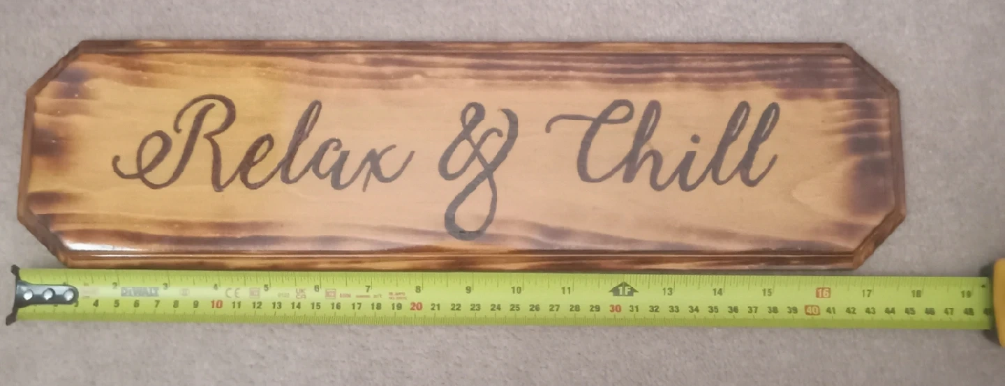 15Here's a cute wooden sign that has been wood burned and says "Relax & Chill"! It's perfect for adding a cozy vibe to any room. It measures about 18 inches long. The wood is also coated with a clear gloss finish to protect the piece from scratches, moisture and UV exposure.