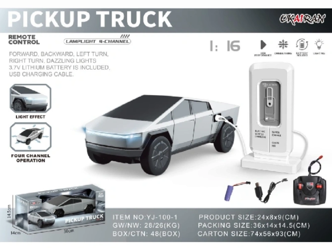Selling a brand new Okairan Remote Control Pickup Truck! It has four channel operation and dazzling lights. The box includes a 3.7V lithium battery and USB charging cable. Features: - Forward, backward, left turn, right turn - Lamplight 4-channel - Product size: 24x8x9 cm - Packing size: 36x14x14.5 cm