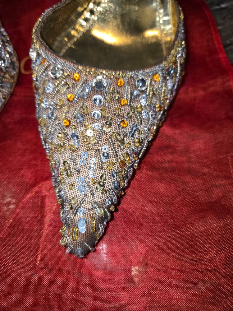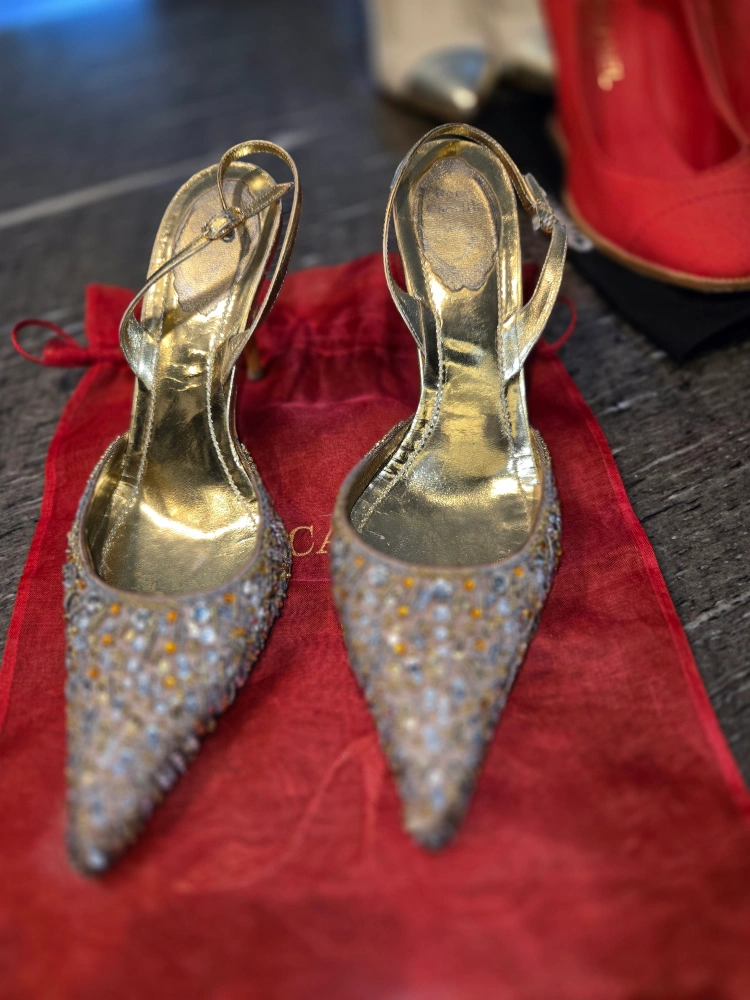 Gorgeous Rene Caovilla slingback heels with intricate embellishments! These heels are perfect for adding a touch of sparkle to any outfit. They show some signs of wear, but they are still in great condition and ready for a new home!