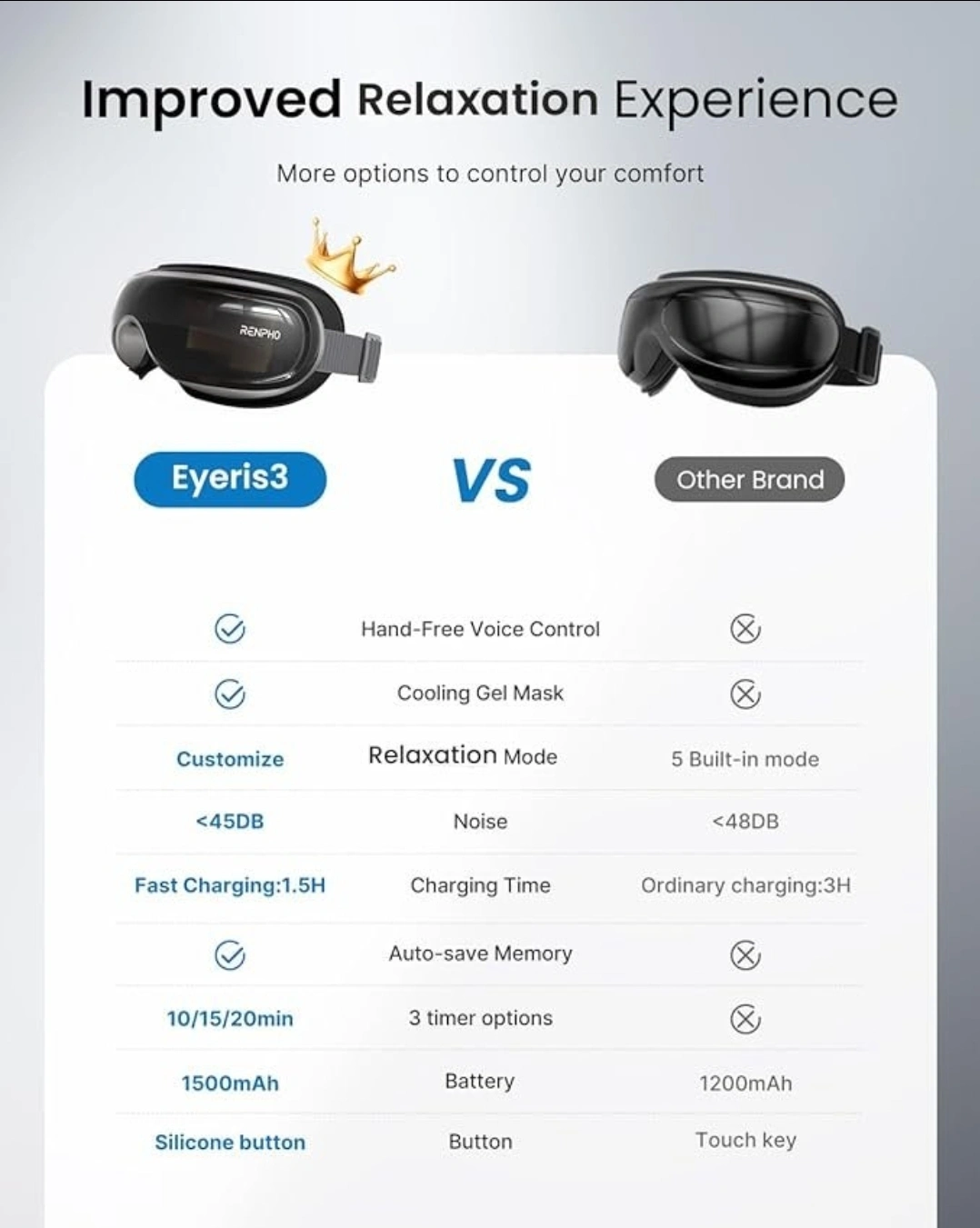 33Experience improved relaxation with the RENPHO Eyeris3! It features hand-free voice control, so you can simply say "Hi Eyeris" to switch between up to 18 voice commands. This eye massager also has a customizable relaxation mode and 3 intensity levels. Plus, it comes with a removable cooling gel mask for extra comfort