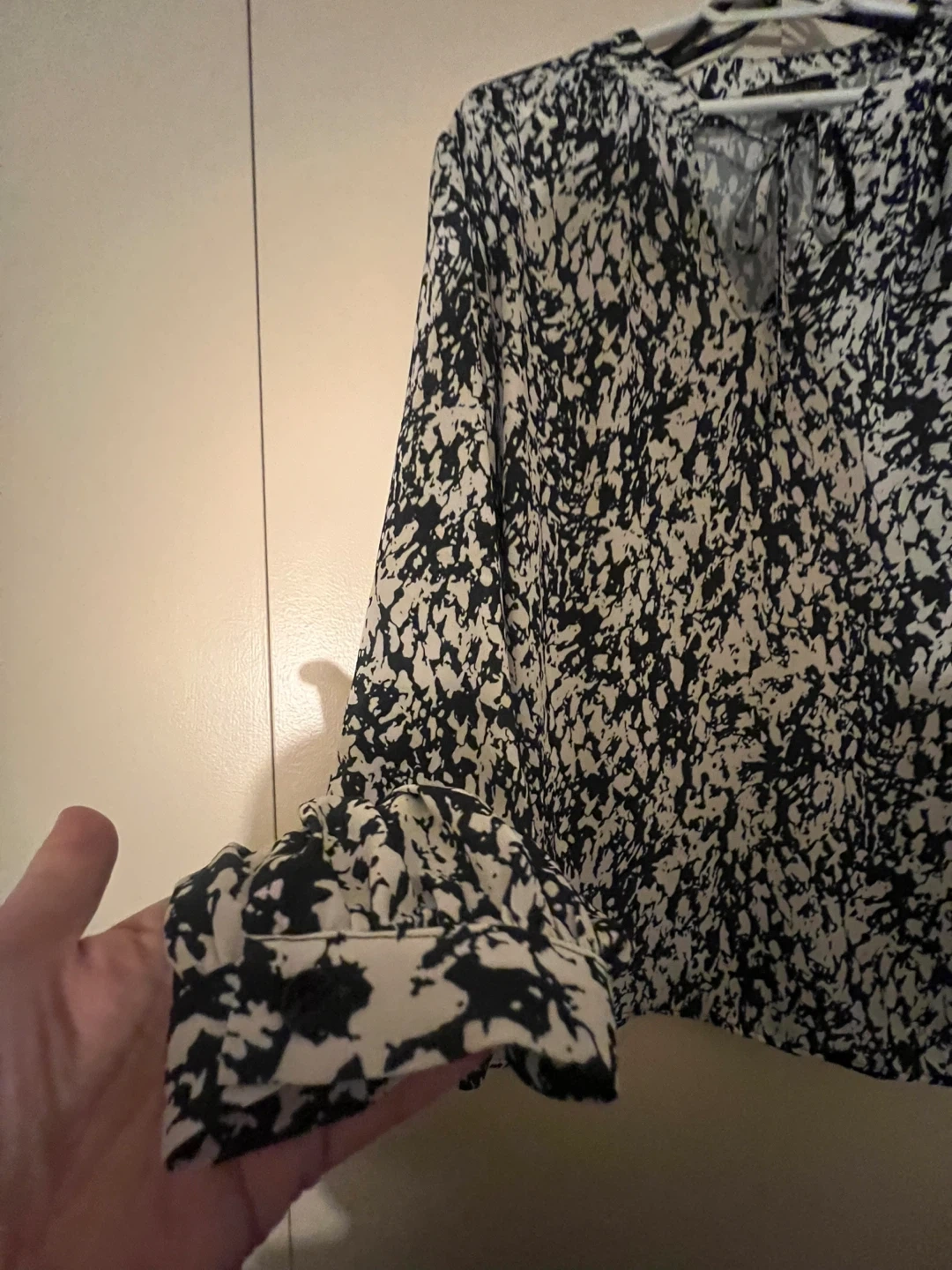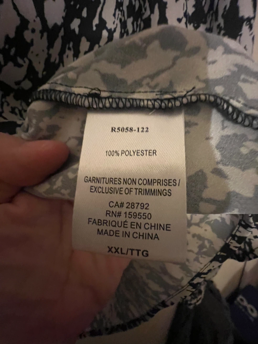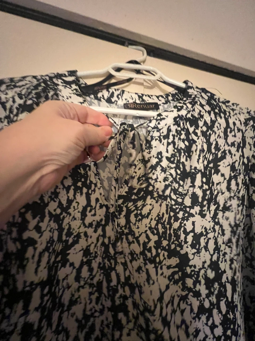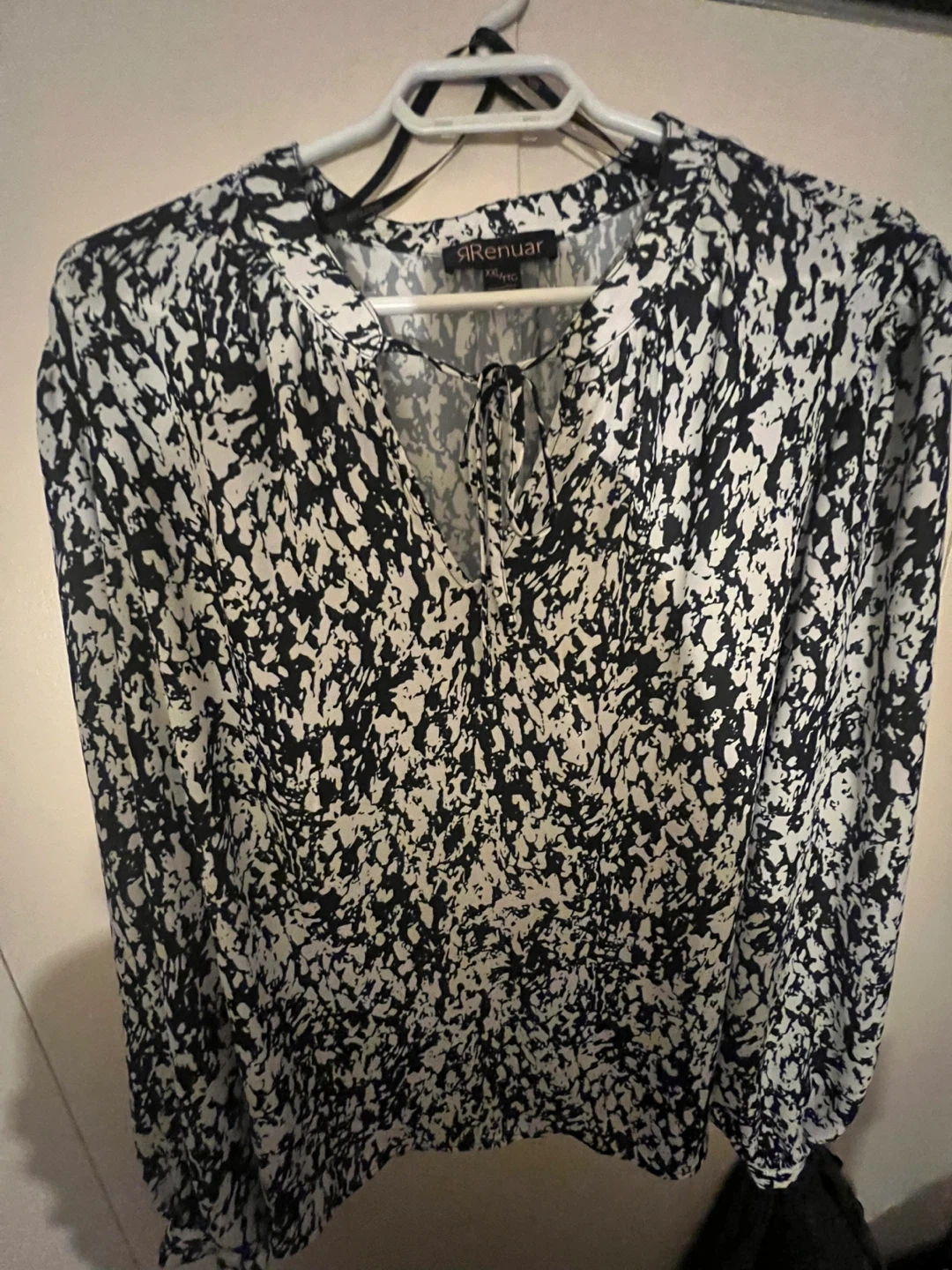 78Here's a stylish Renuar blouse in a striking black and white pattern! It's a size XXL and made from 100% polyester, so it's comfy and easy to care for Gently used