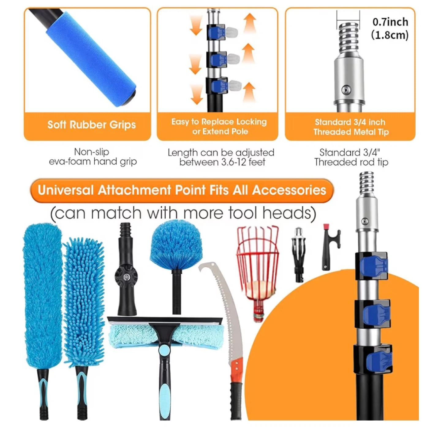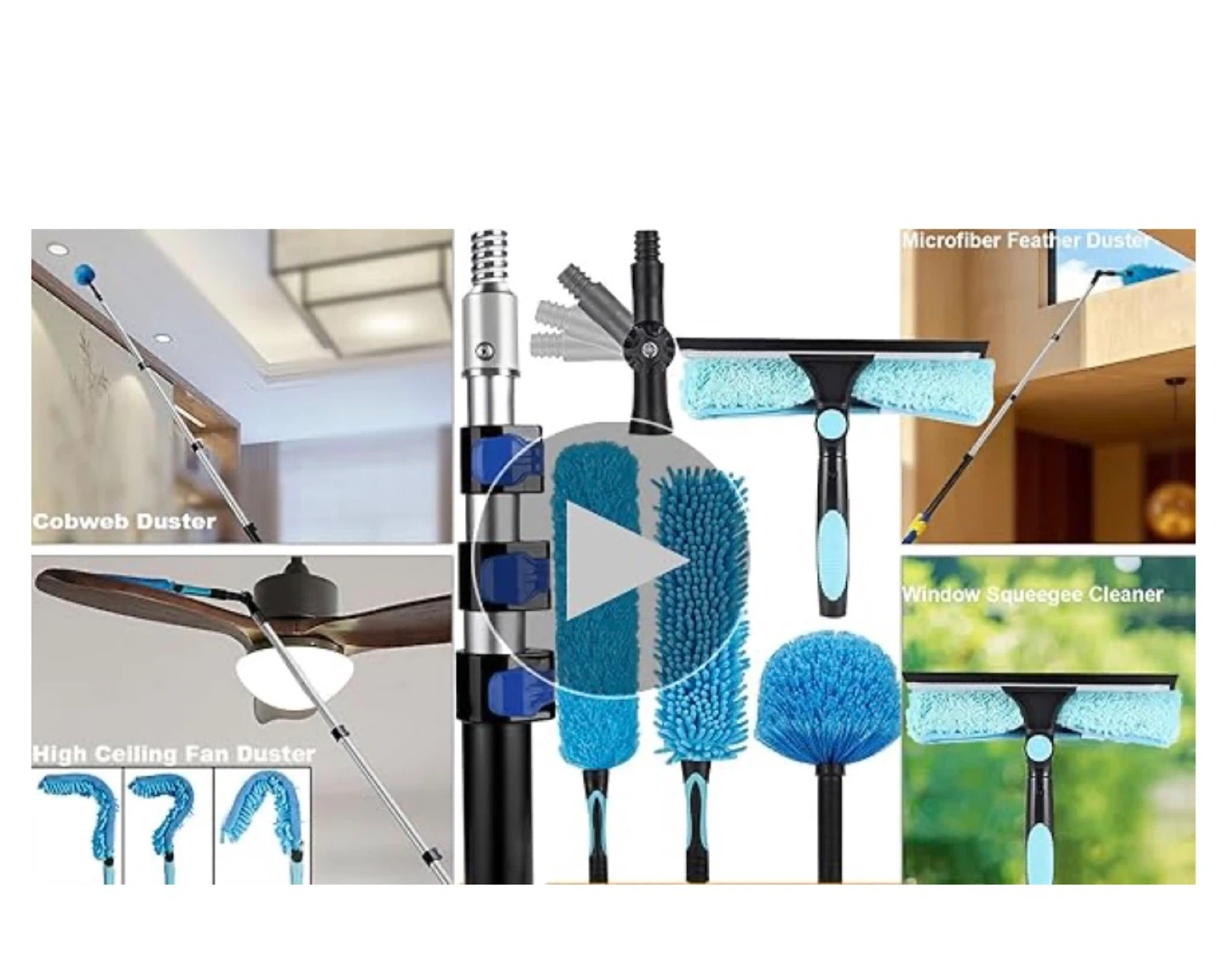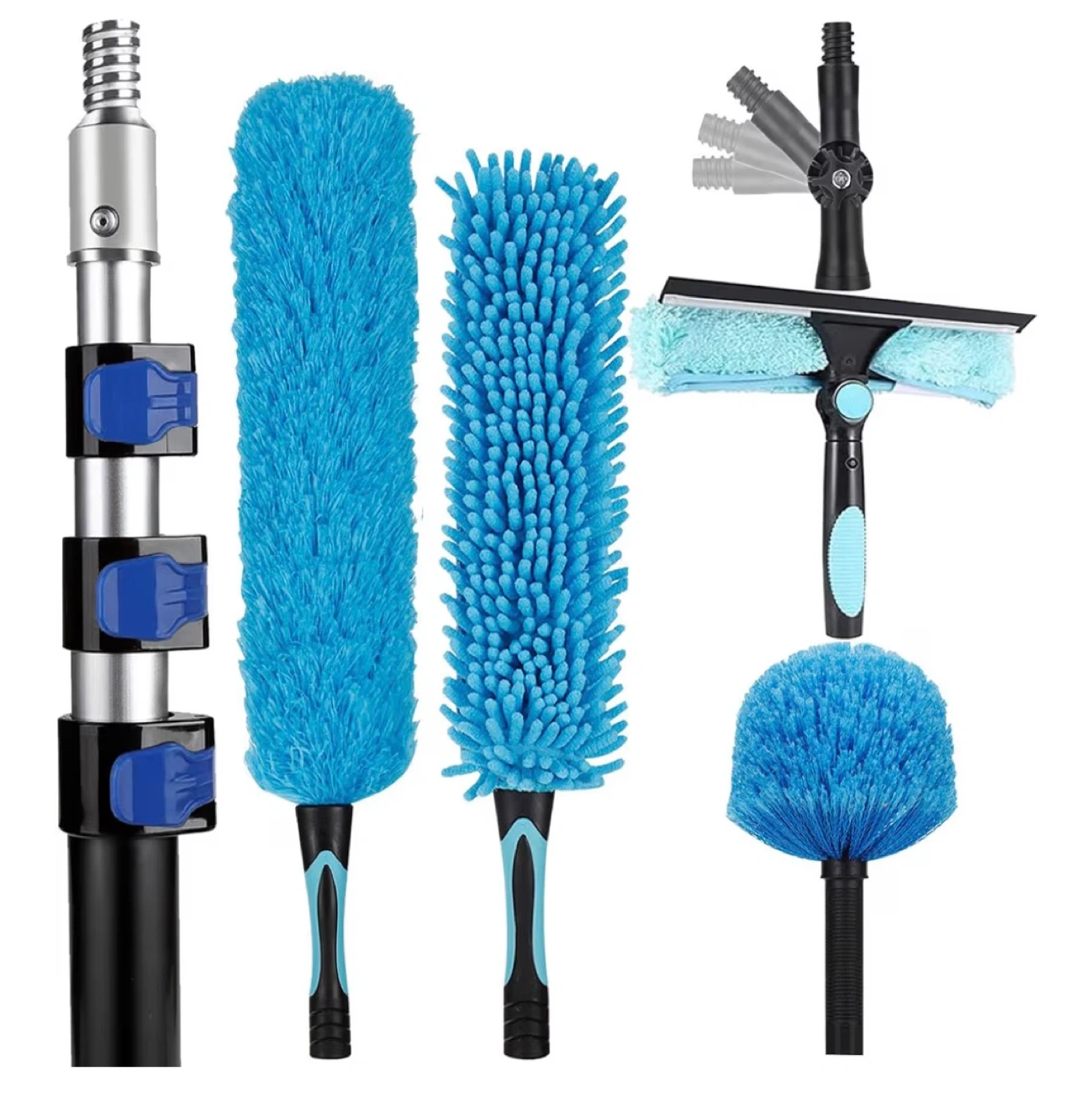 This set includes a microfiber feather duster, cobweb duster, and window squeegee cleaner with an extendable pole. The length adjusts from 3.6 to 12 feet, perfect for reaching high ceilings and windows. It's got soft rubber grips and a universal attachment point for all accessories.