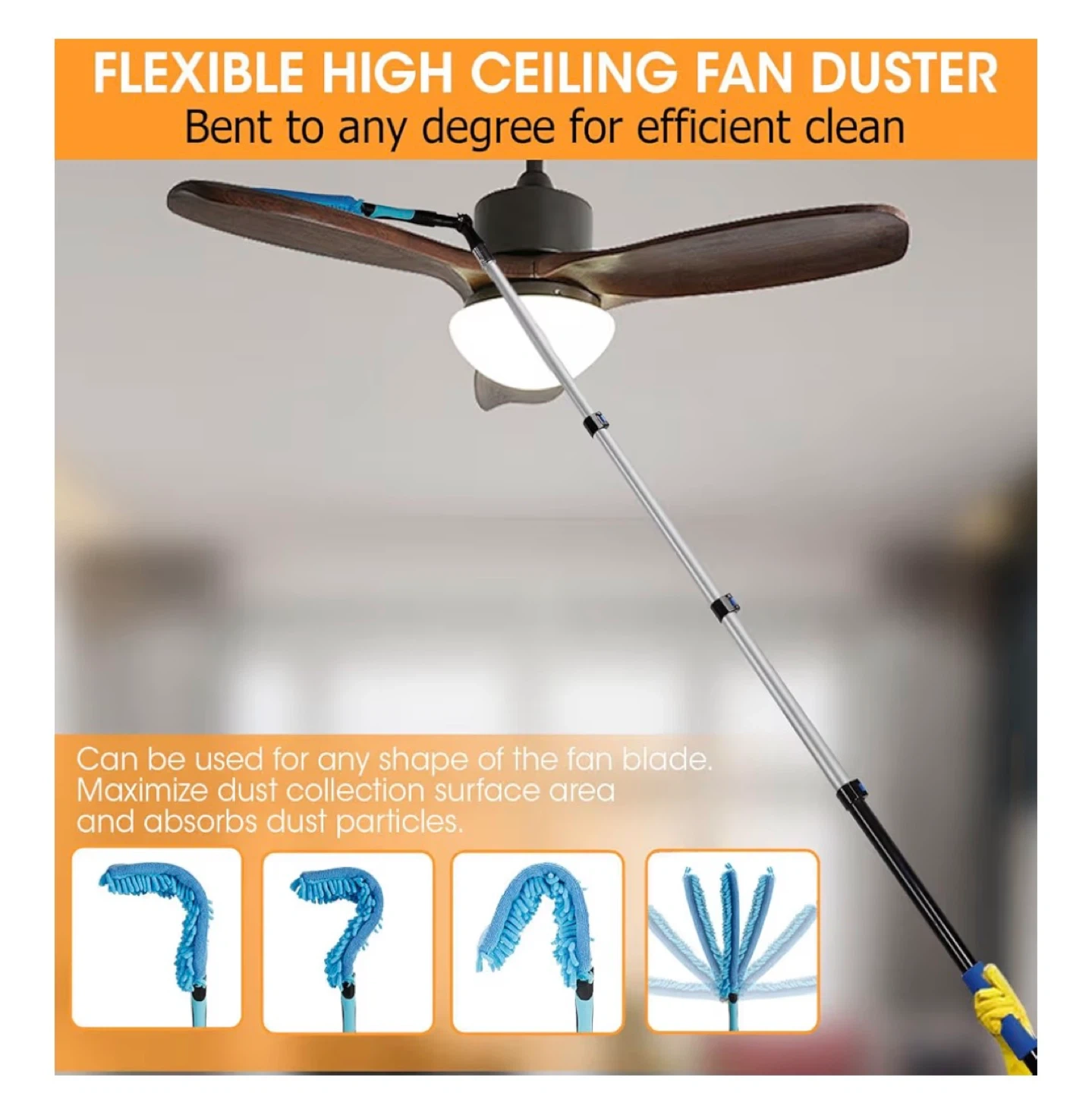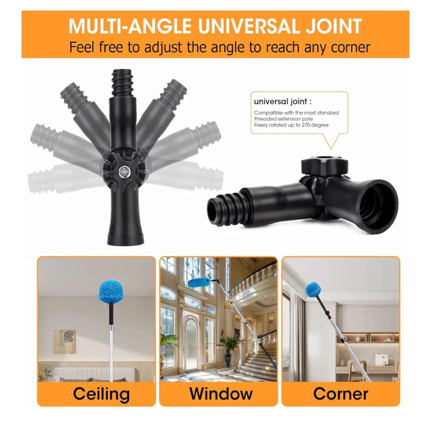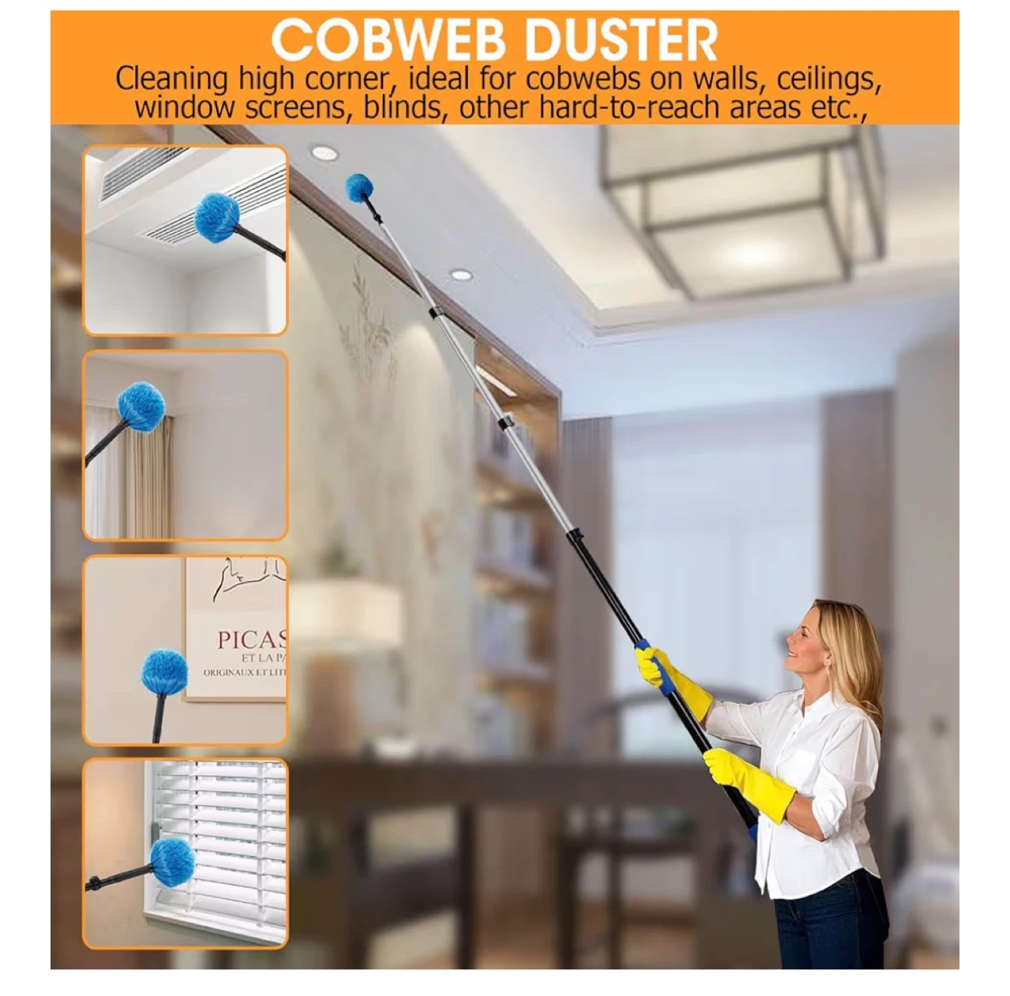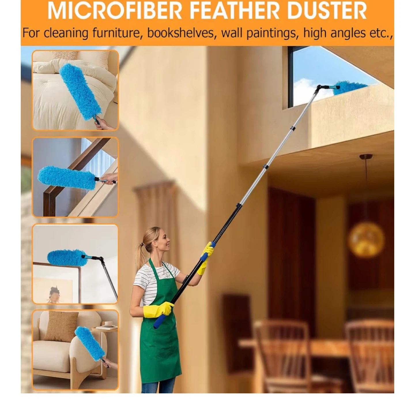 This set includes a microfiber feather duster, cobweb duster, and window squeegee cleaner with an extendable pole. The length adjusts from 3.6 to 12 feet, perfect for reaching high ceilings and windows. It's got soft rubber grips and a universal attachment point for all accessories.
