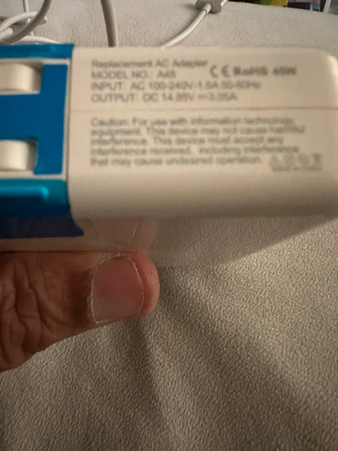 248Selling a replacement AC adapter. It's a 45W charger . It supports AC 100-240V~1.5A 50-60Hz input and DC 14.85V 3.05A output Mac book