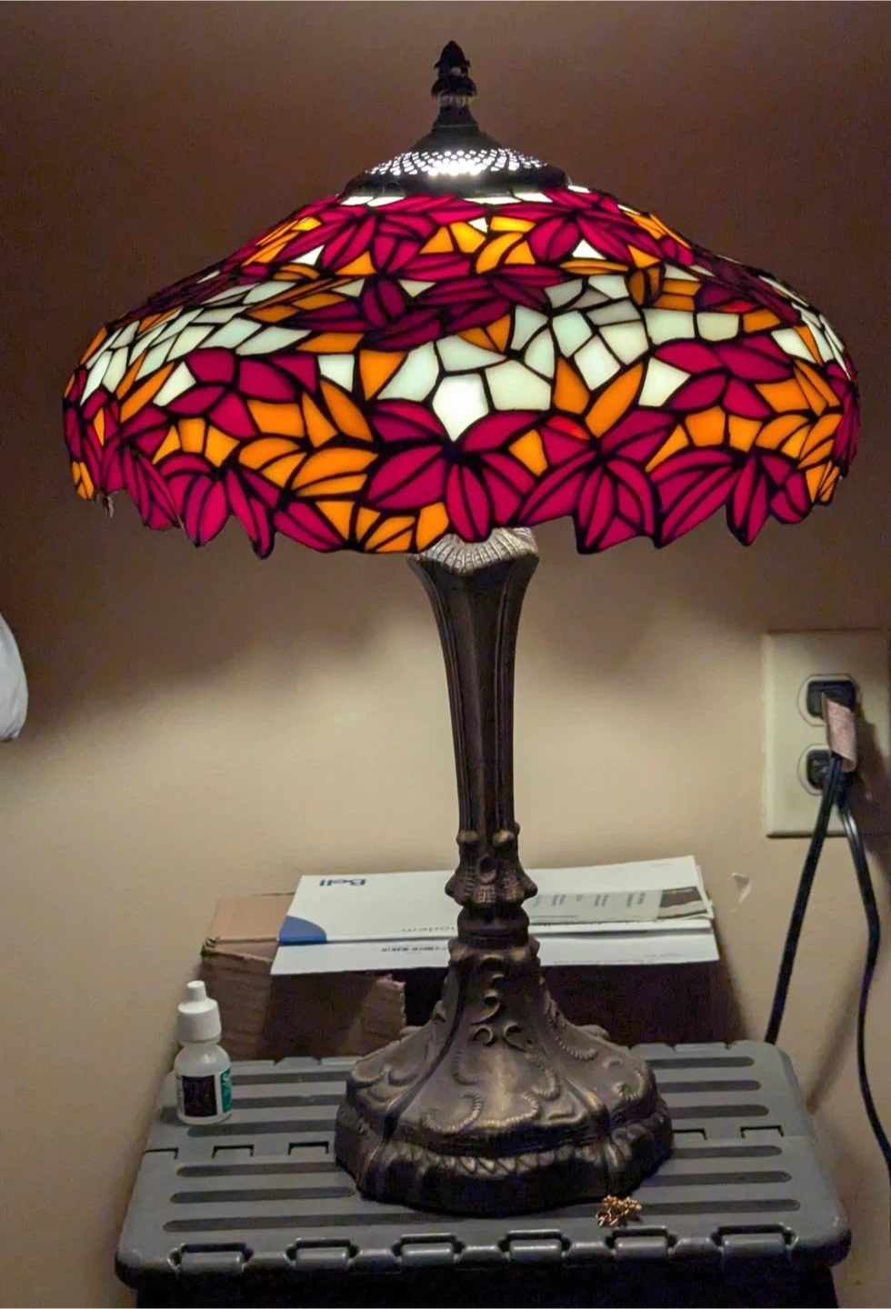 Selling a beautiful table lamp. It has a lovely floral design with red, orange, and white pieces. The base is a heavy metal and with it’s ornate design it adds to the lamp's charm. It would look great in any room!