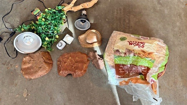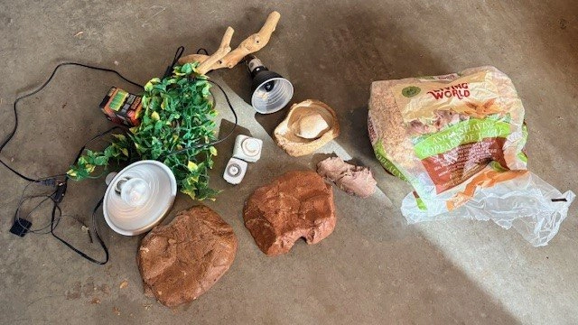 10Selling a collection of essential accessories for a snake or reptile terrarium, all in good condition: 2 heating lamps with built-in timers Shelters/hides for comfort and security Water dish Aspen shavings for bedding Decorative fake plants for a natural look Perfect for setting up a new habitat or upgrading an existing one.