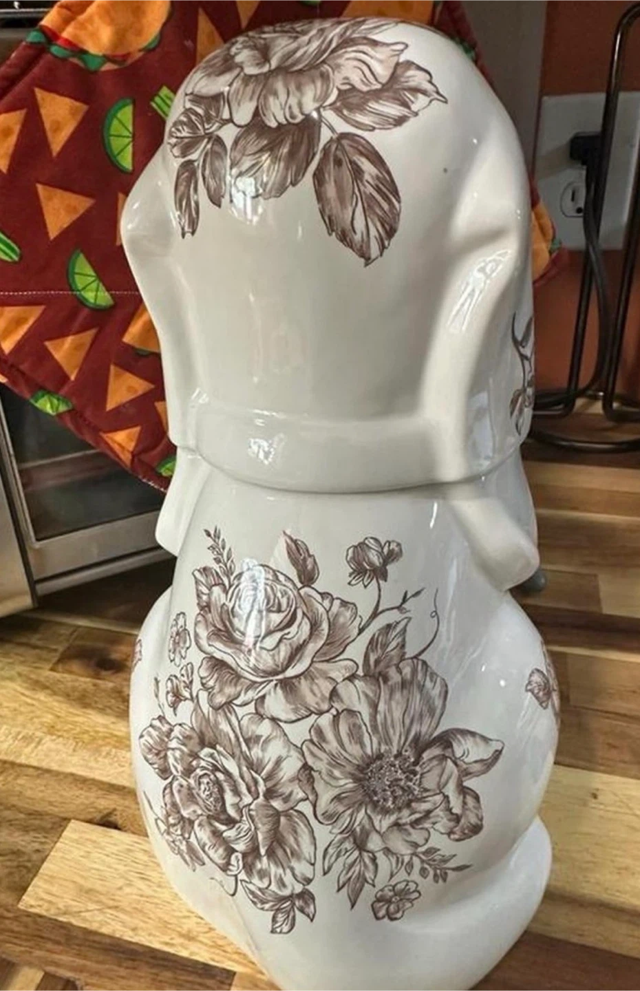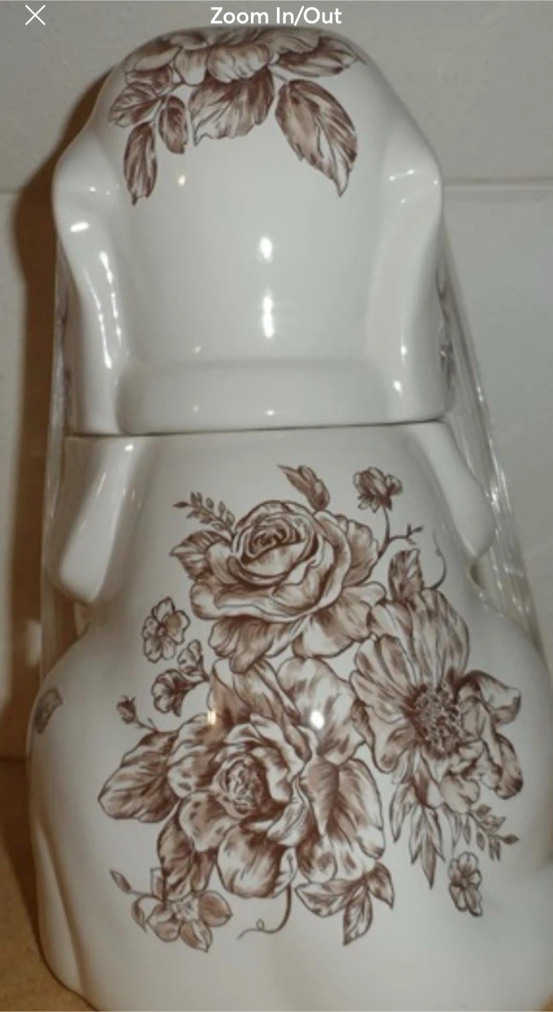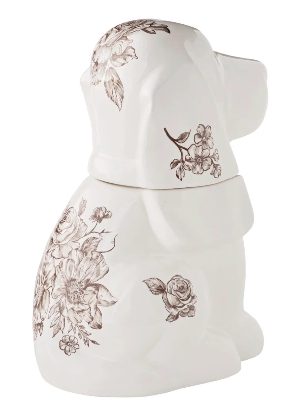 This ceramic jar is shaped like a cute dog and features a lovely brown floral pattern. It's perfect for storing cookies or other small treats. The lid fits securely on top.