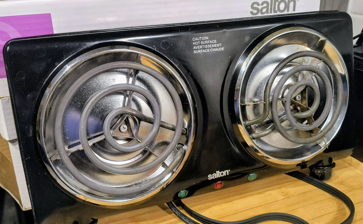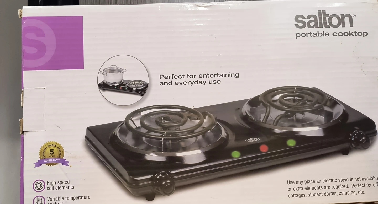 This is a Salton portable double burner cooktop, model HP 1427. It features high speed coil elements and variable temperature controls. It's perfect for entertaining and everyday use, ideal for cottages, student dorms, or camping.