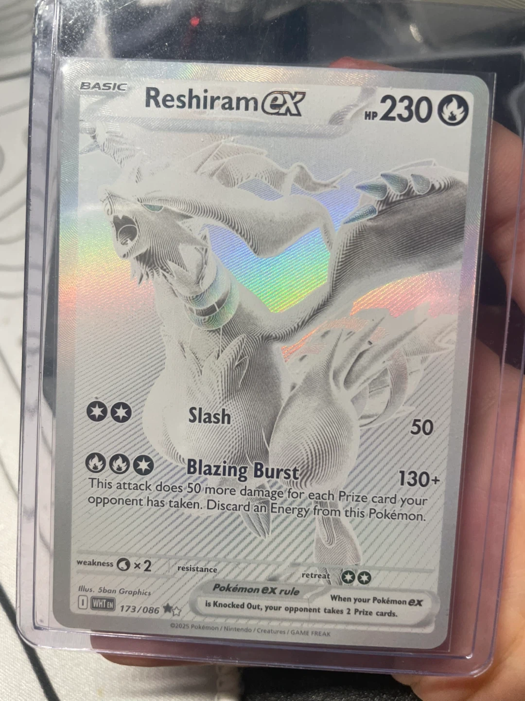 Selling a Reshiram EX Pokemon card. It has a HP of 230 and features the moves Slash and Blazing Burst. The card is from the WHT EN series, numbered 173/086. dm if interested pick up or meet up at yonge and sheppard station