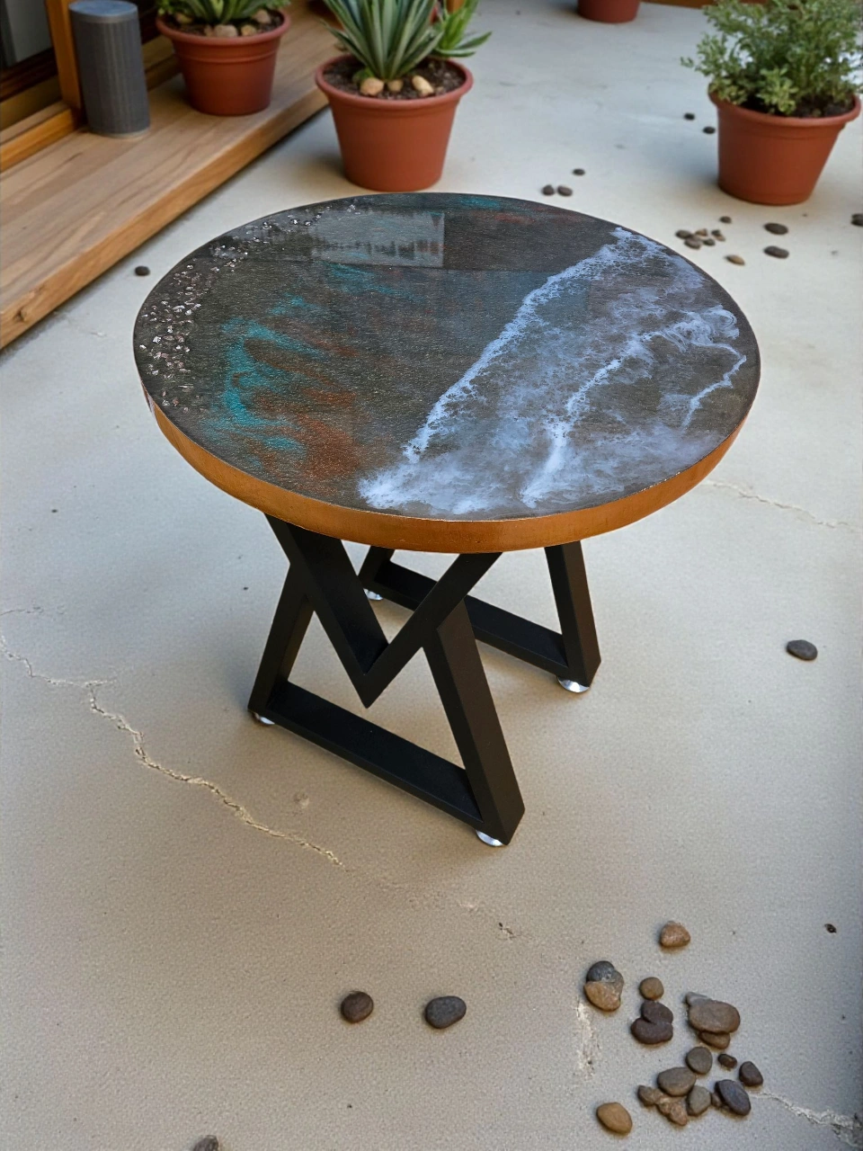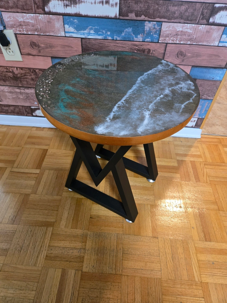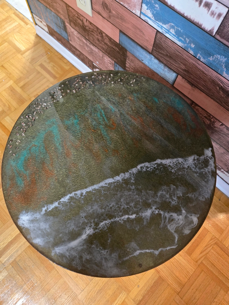 This is a unique round side table featuring a beautiful resin art design on the top. The table has a sturdy black metal base and would make a great addition to any living space. It's perfect for displaying decorative items or holding your coffee