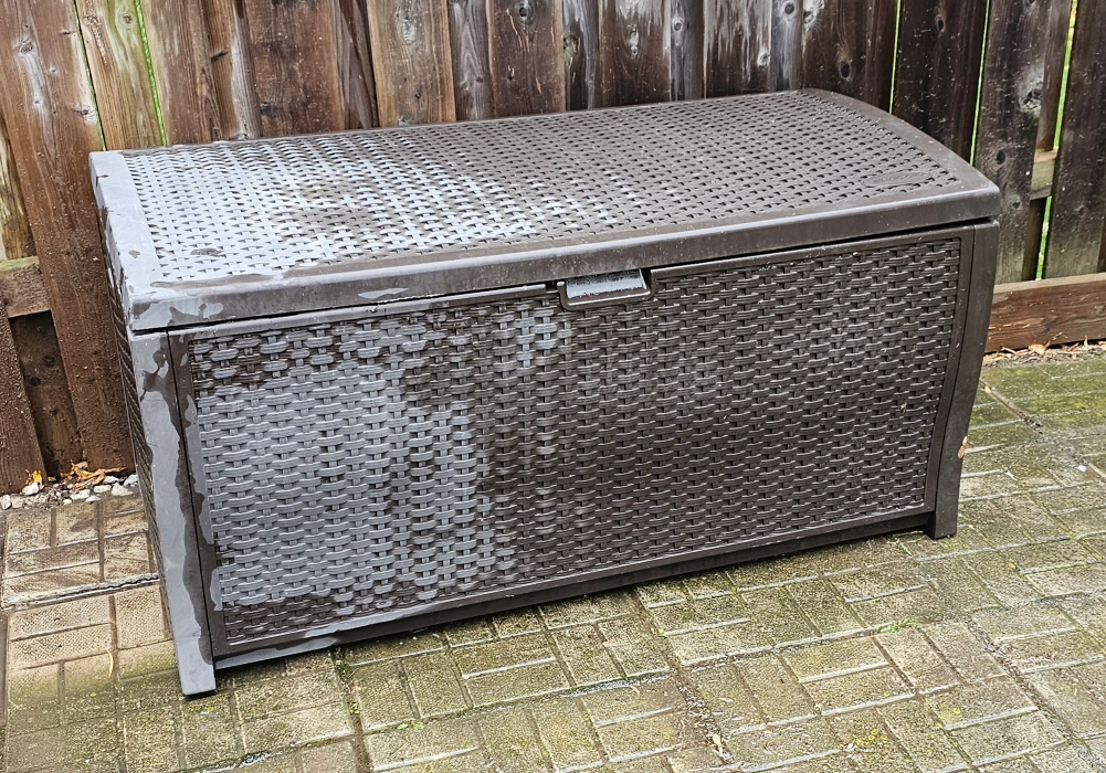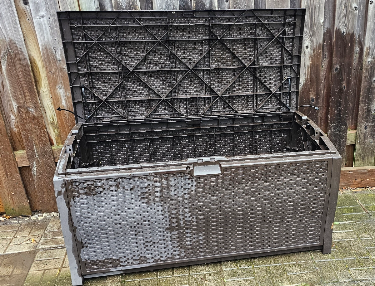 Selling a resin wicker outdoor storage deck box. It's great for storing cushions, gardening tools, or pool supplies. This box is durable and weather-resistant, perfect for keeping your outdoor essentials organized and protected from the elements