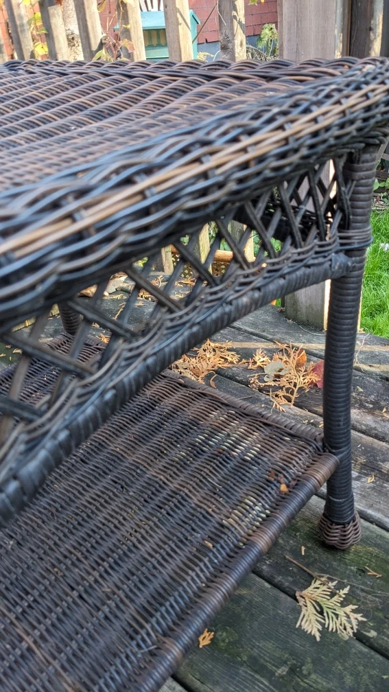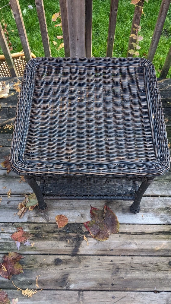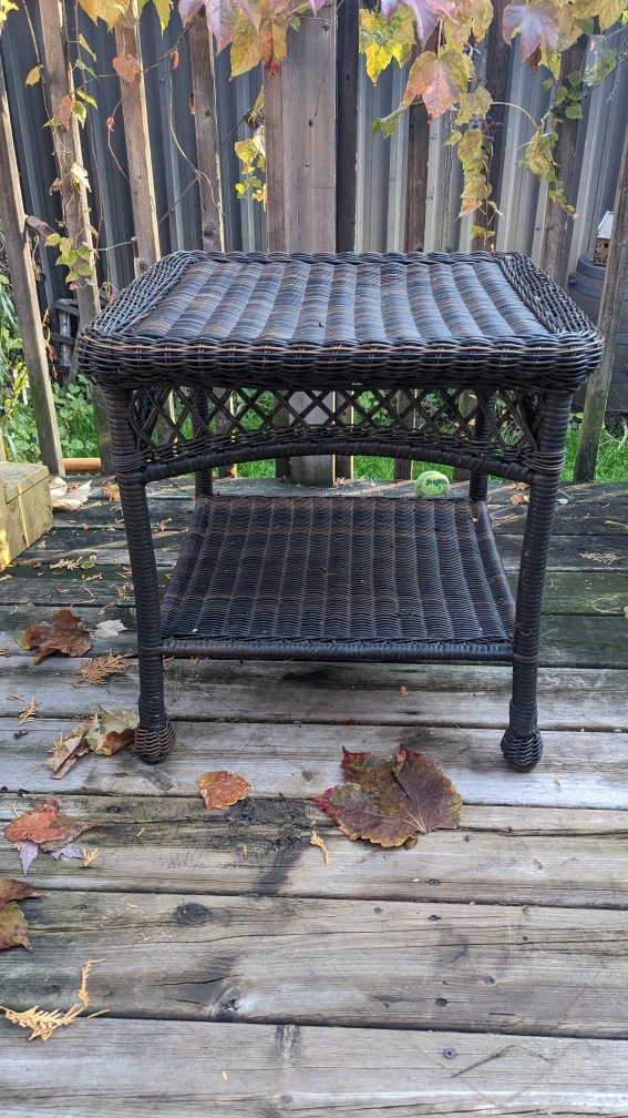 120Selling a cute wicker side table, perfect for adding a touch of rustic charm to your home! It's in great shape and features a lower shelf for extra storage or decor