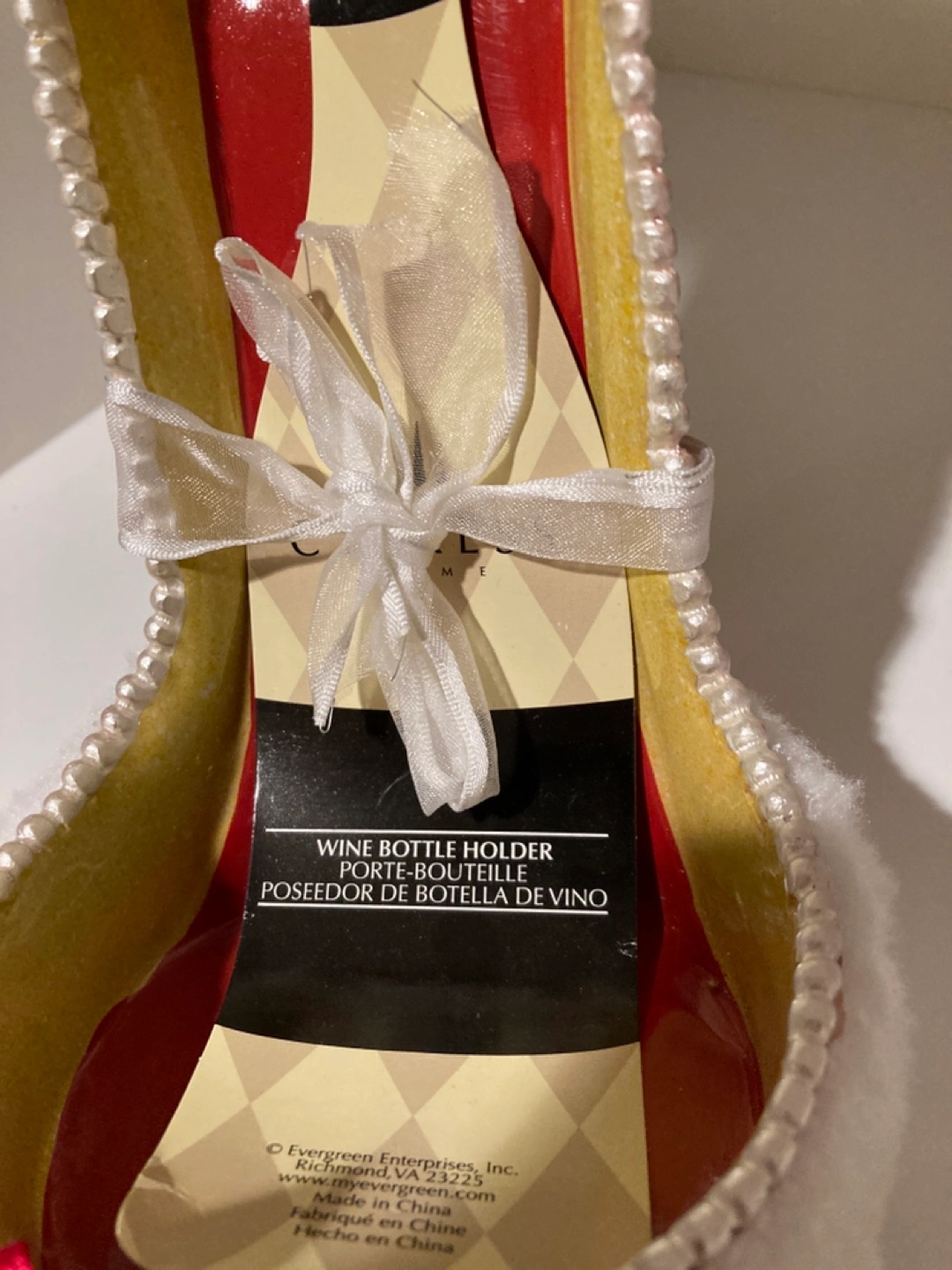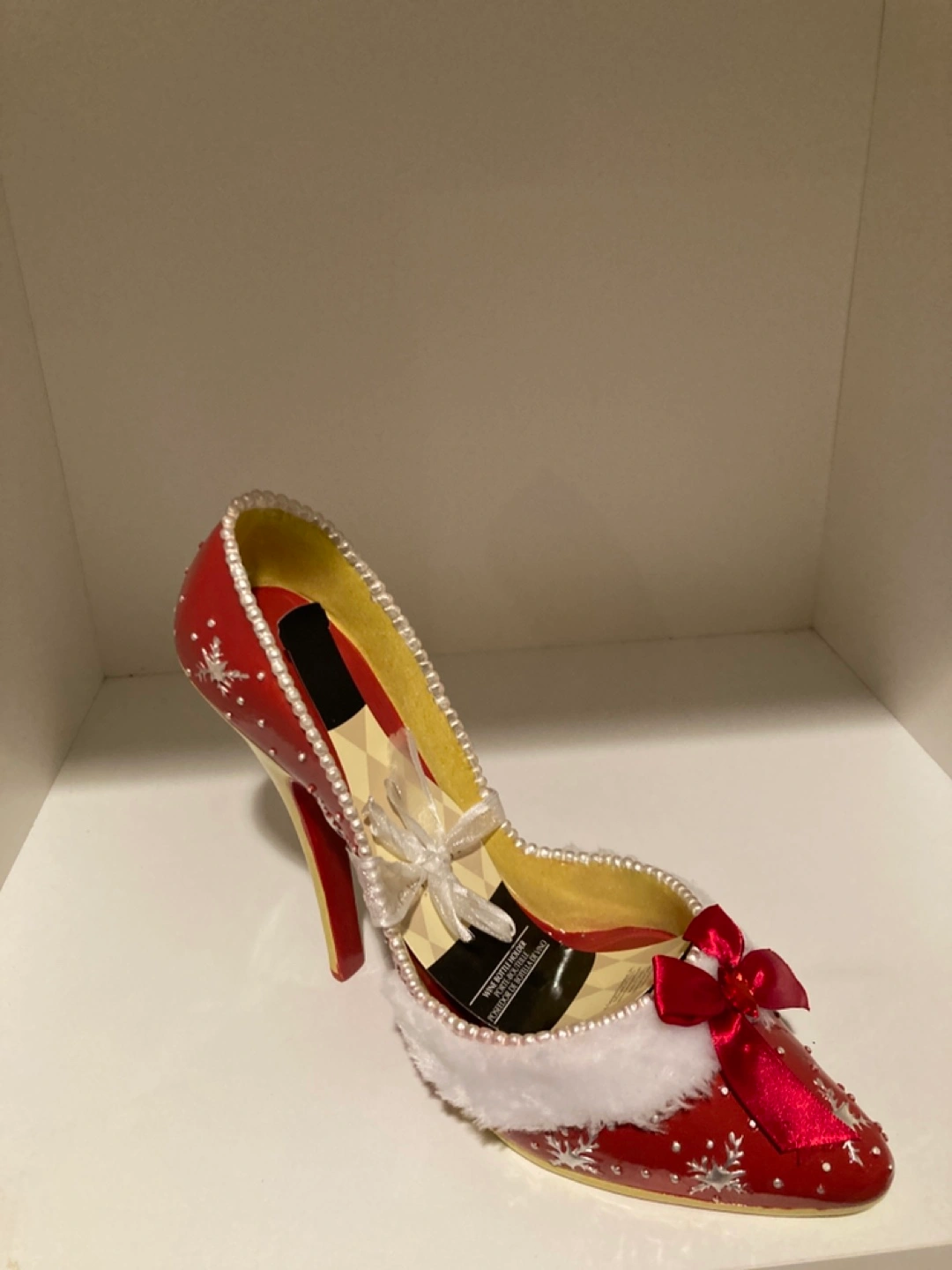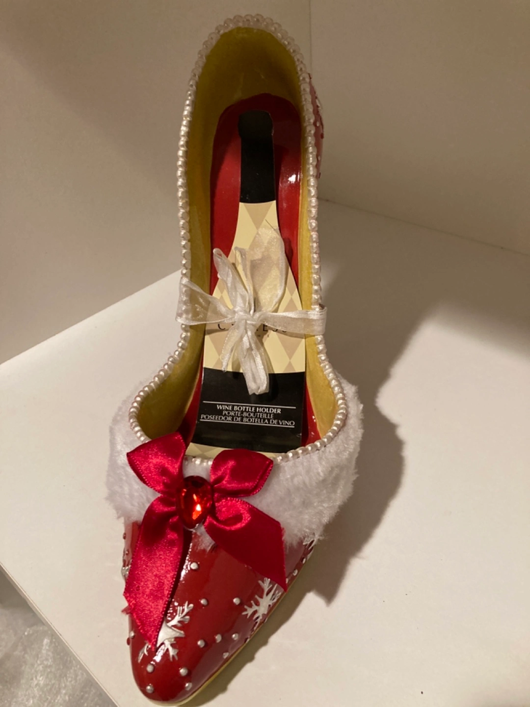 Adorable wine bottle holder. Shaped like a red high heel shoe. Decorated with snowflakes and pearls. Features a white faux fur trim. Perfect for holiday entertaining. New