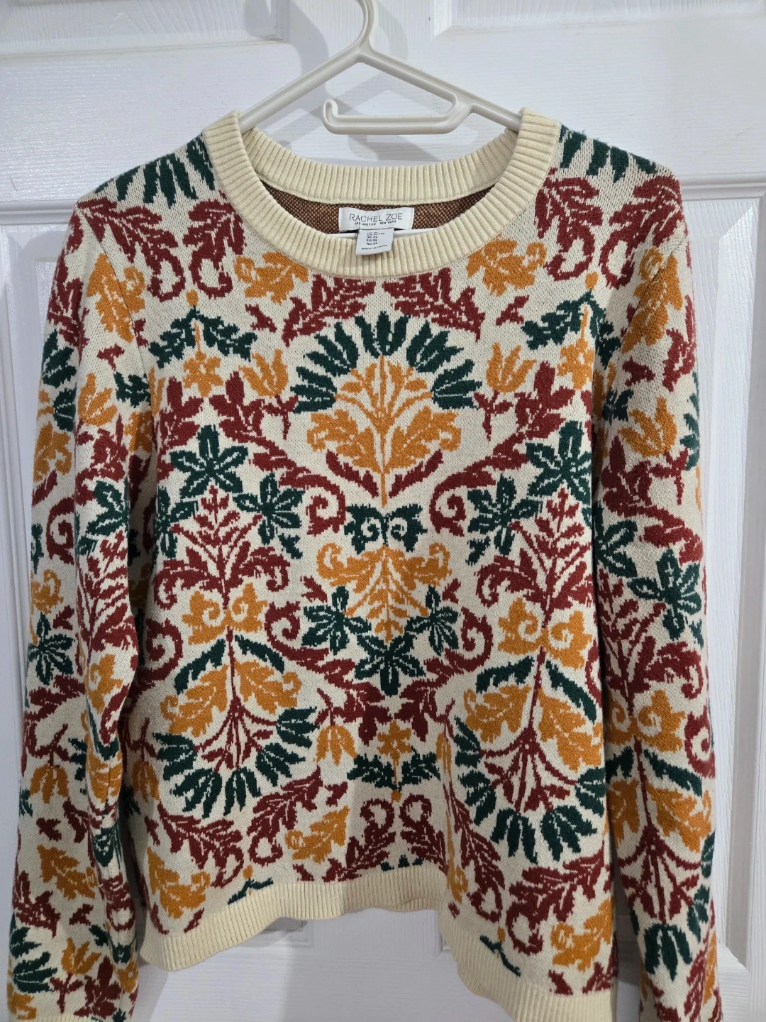 This is a Rachel Zoe crew neck sweater. It features a cream base with a colourful leaf and floral pattern in red, green, and gold. The sweater has ribbed cuffs and hem.