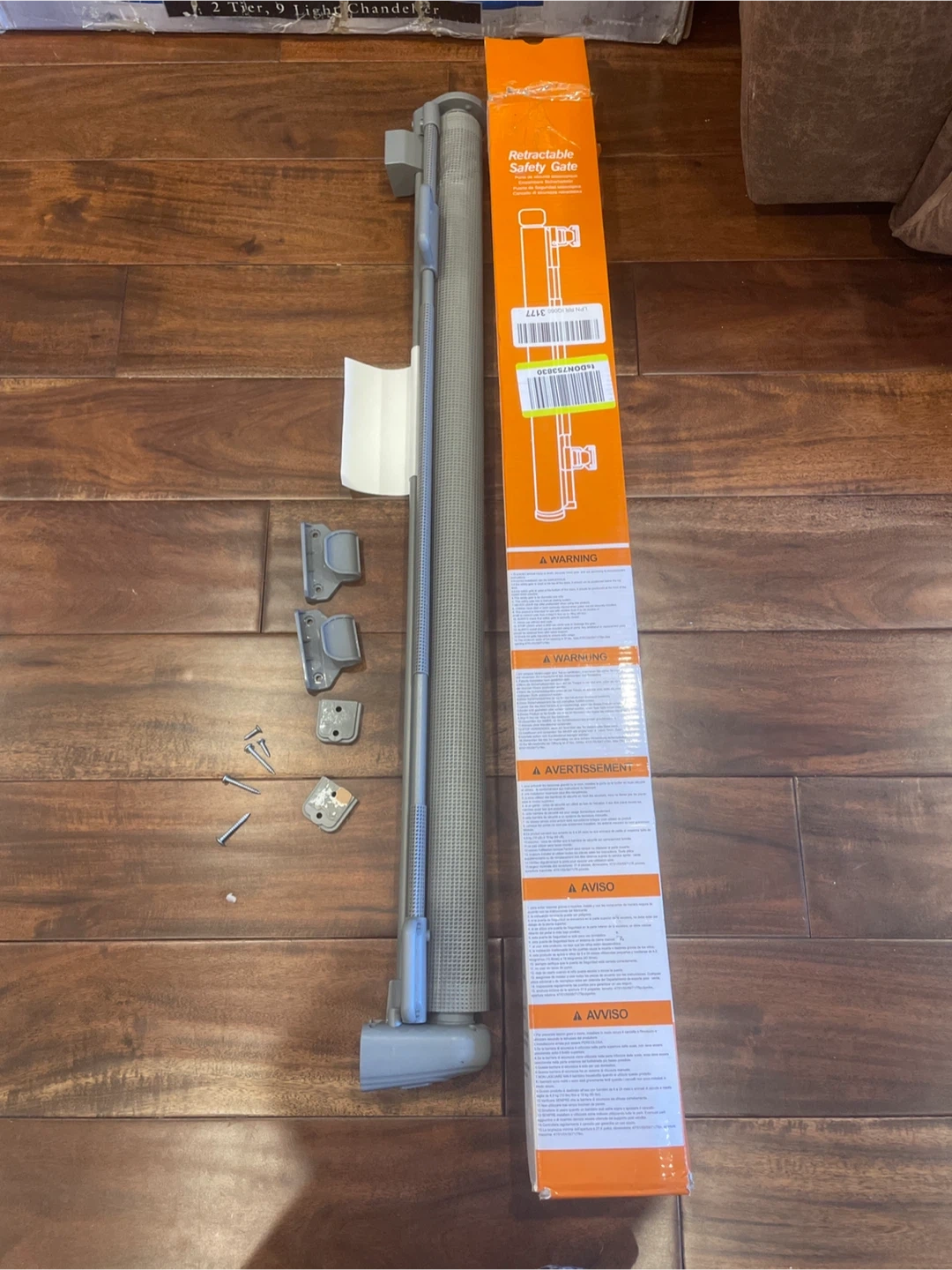 Selling a retractable safety gate. It is used and missing a few parts and screws but is fully functional Comes with box.