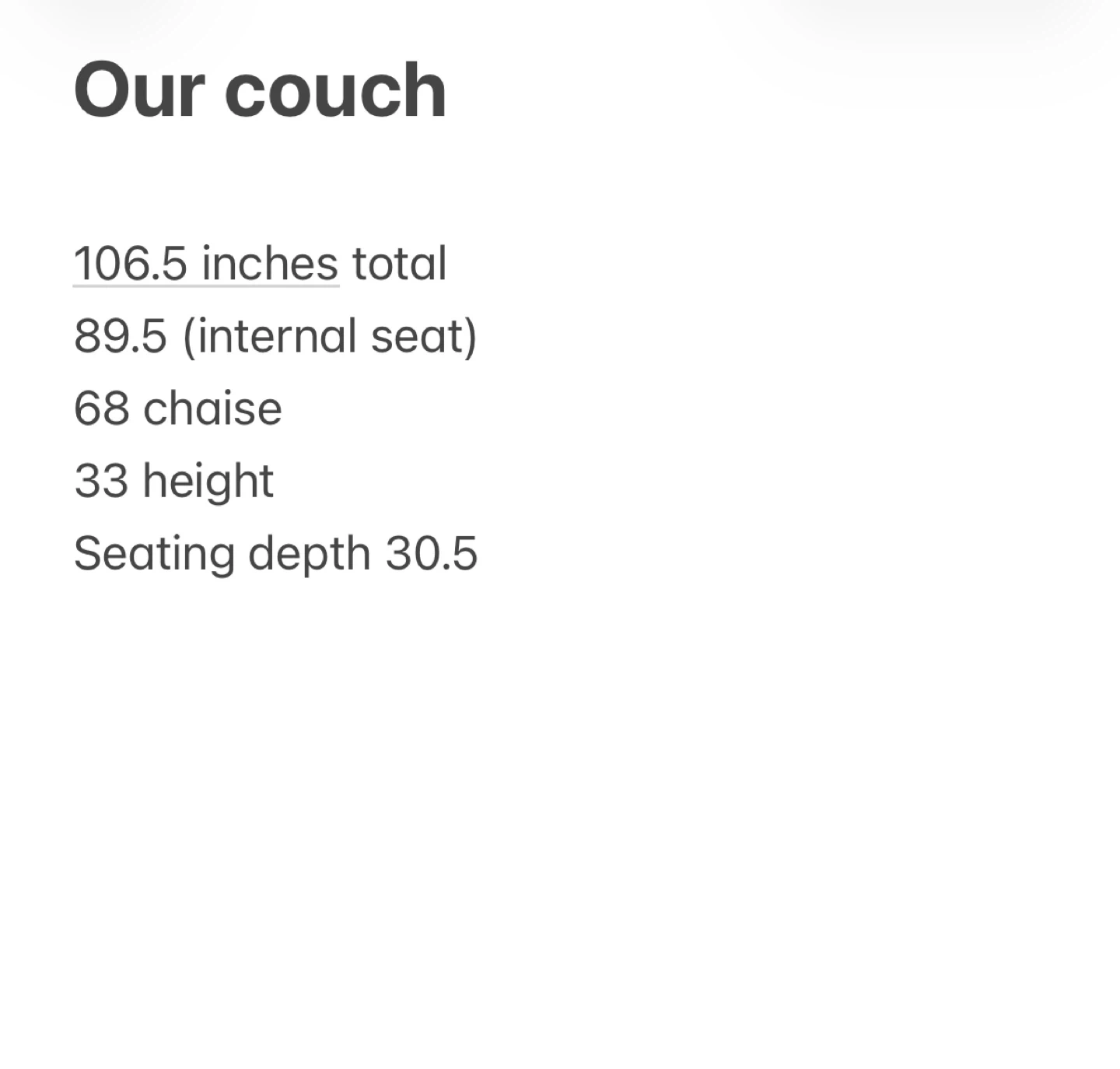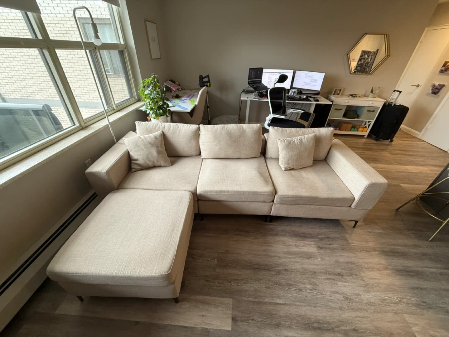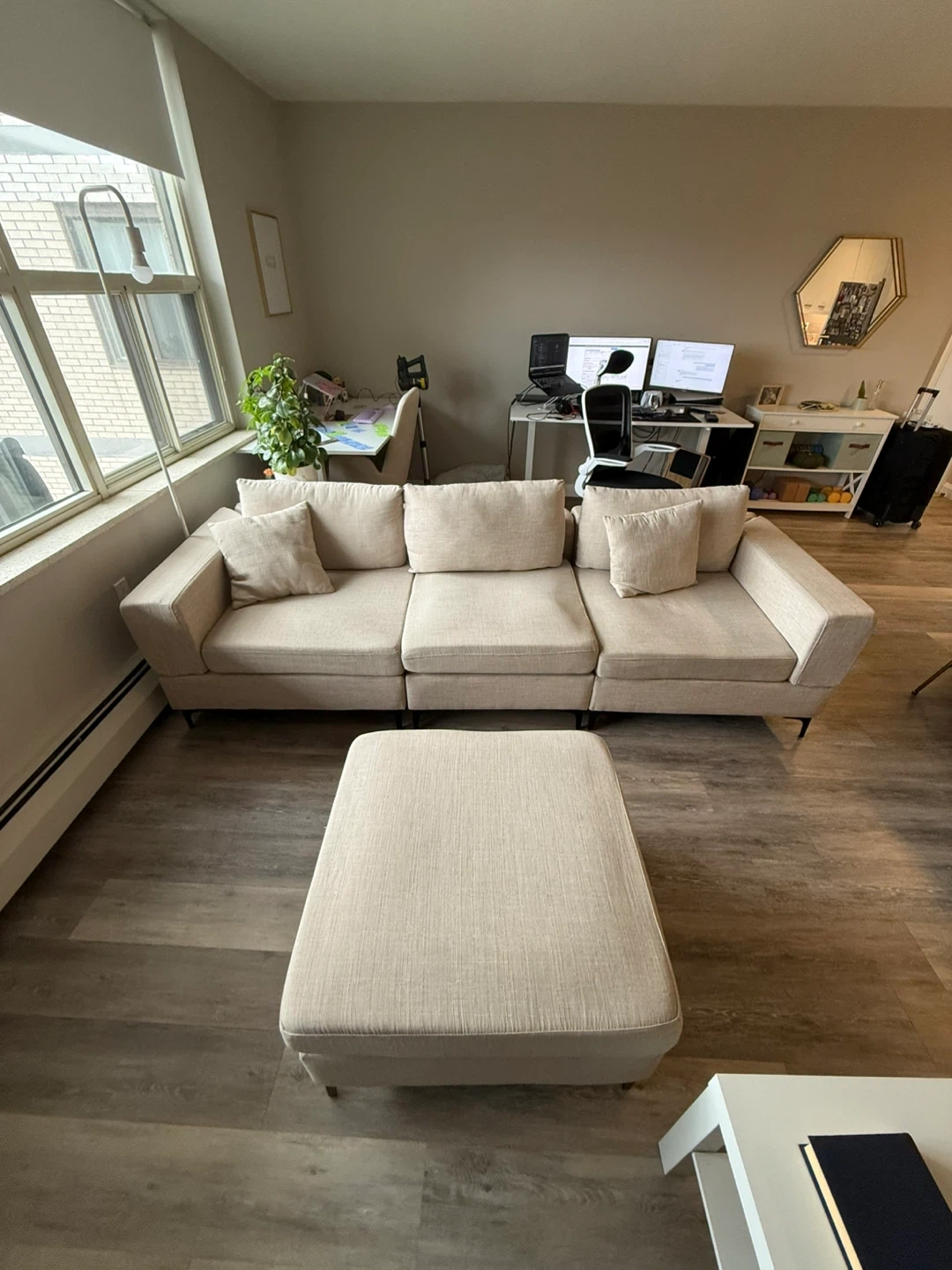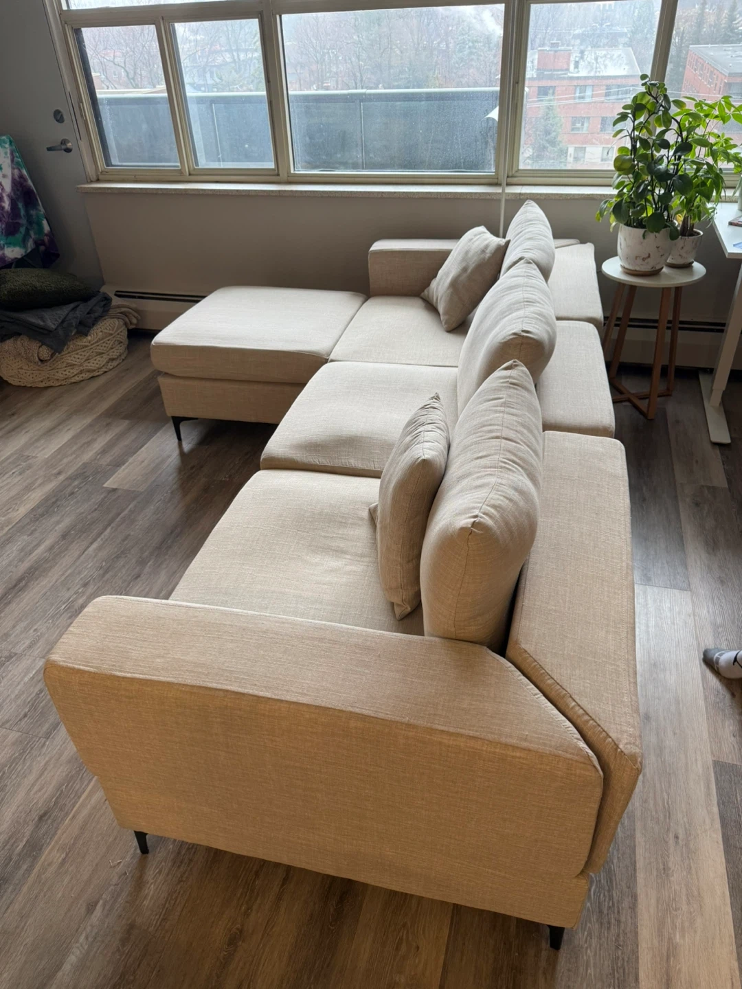 Purchased brand new roughly two years ago. We use it daily so there are a few marks and general use signs. The three piece clicks together with hooks. However one hook hole was misplaced when we bought it so we got our own rod and made a makeshift hook to keep it all together (shown in photos). The 4th piece can be used as a chaise in either side of couch or as an ottoman. Velcro under pillows to secure in place. Couch comes with 2 matching throw pillows. One piece sits back a little further than the others (shown in photos) but that may be able to be fixed with some tightening. Beige in colour.