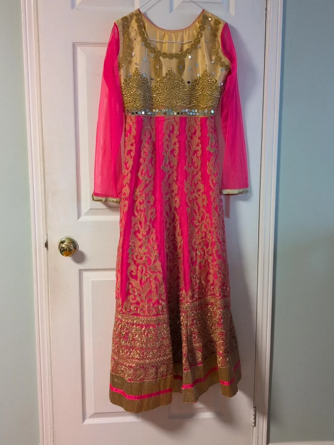 Beautiful women's only Anarkali dress featuring intricate gold embroidery and mirror work on a vibrant pink fabric. It has long sheer sleeves and a round neckline. Perfect for special occasions and cultural events!